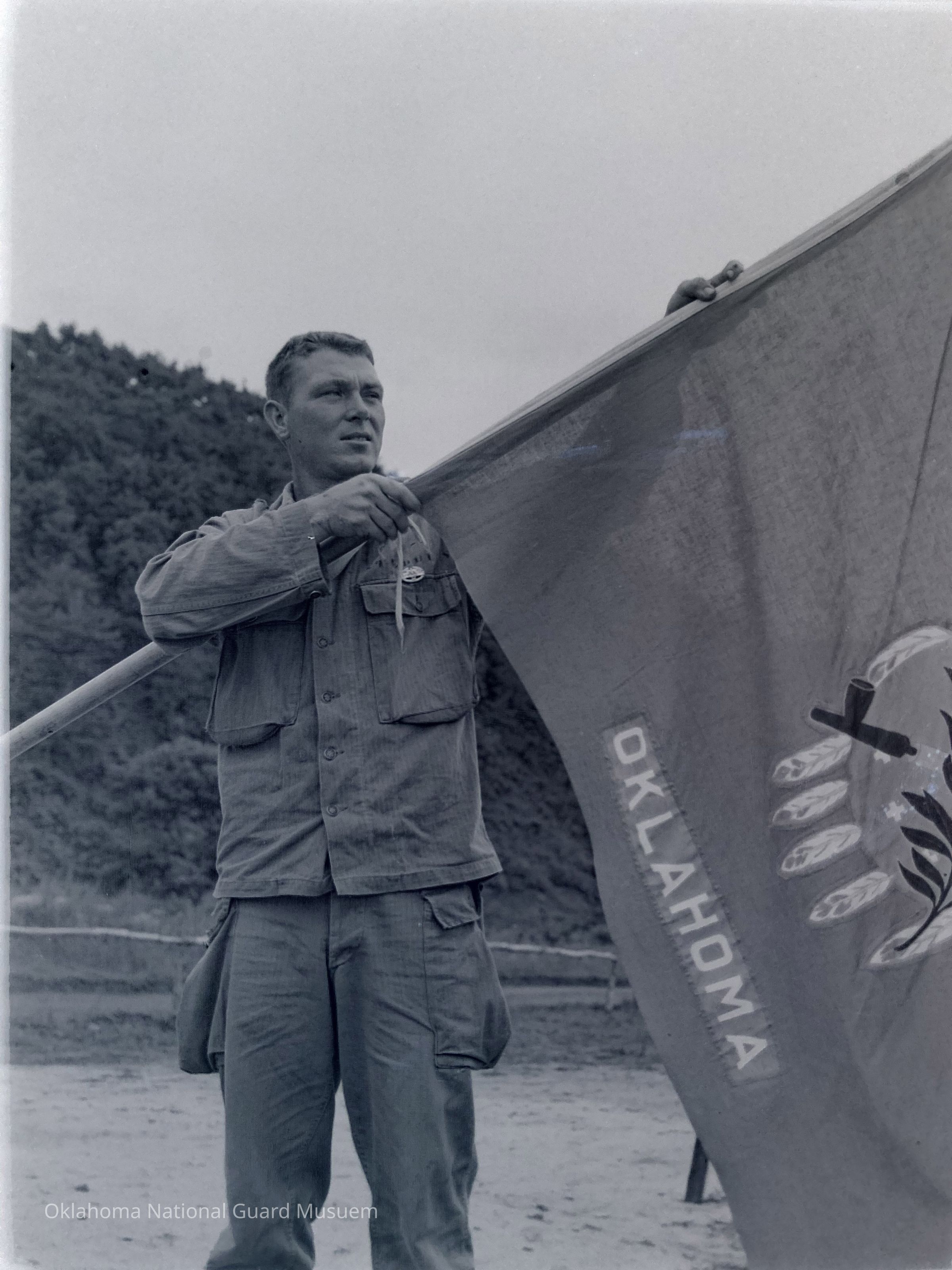 Negative of soldier displaying Oklahoma flag on Hokkaido, Japan