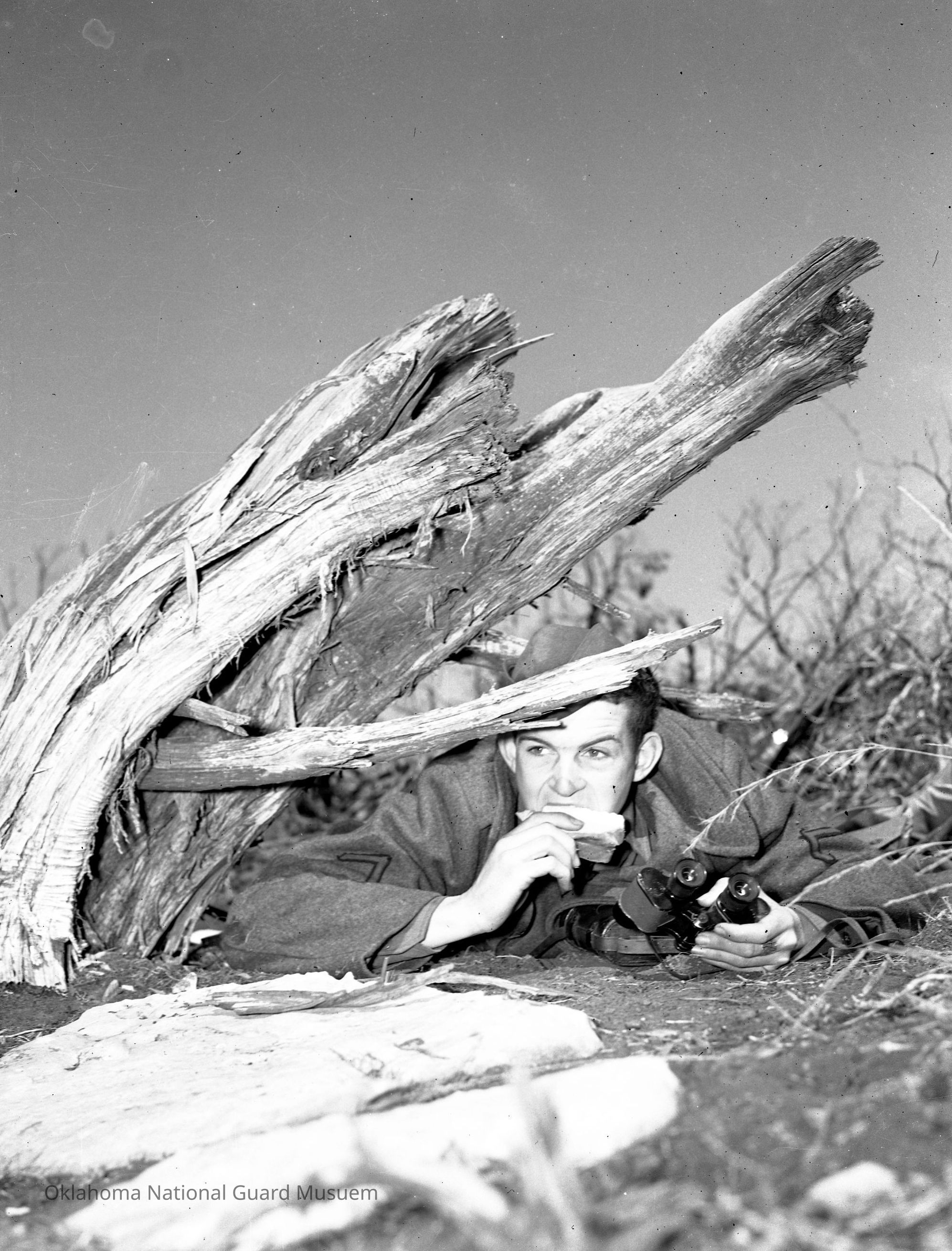 Negative of a soldier eating a sandwich and holding binoculars posed under a tree stump