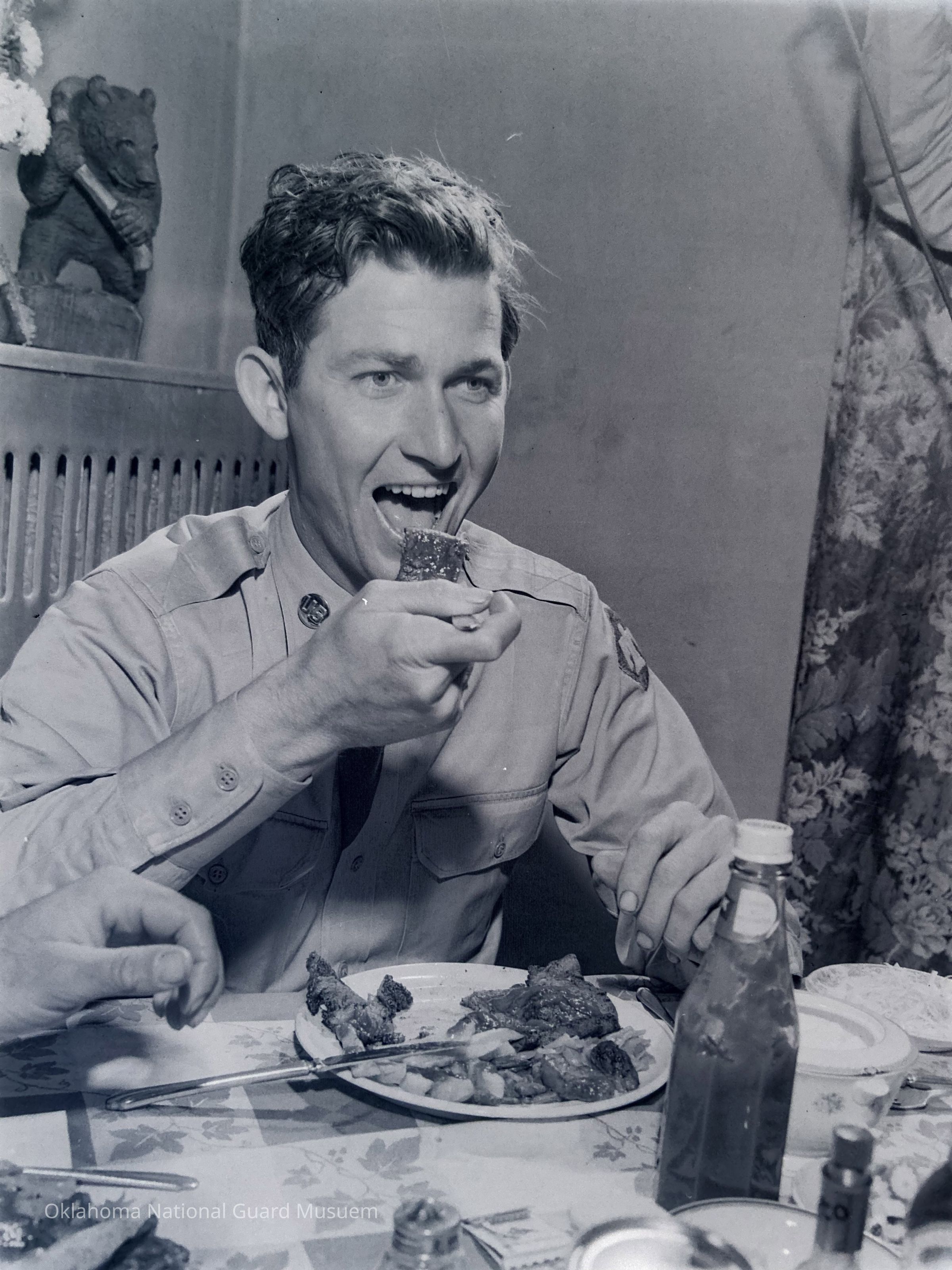 Soldier enjoying his meal of steak and French fries