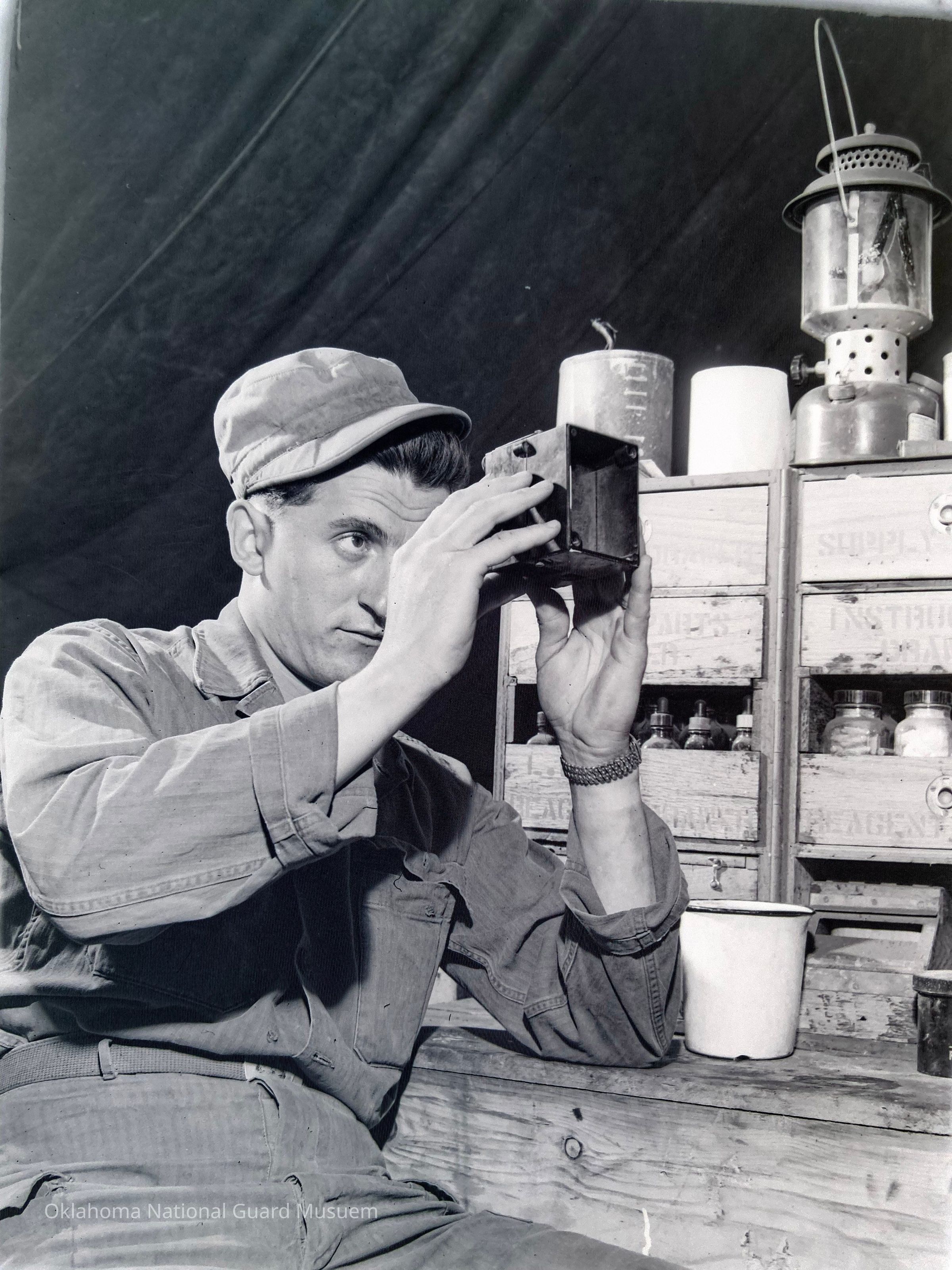 Negative of a soldier examining a piece of gear in a repair shop on Hokkaido, Japan