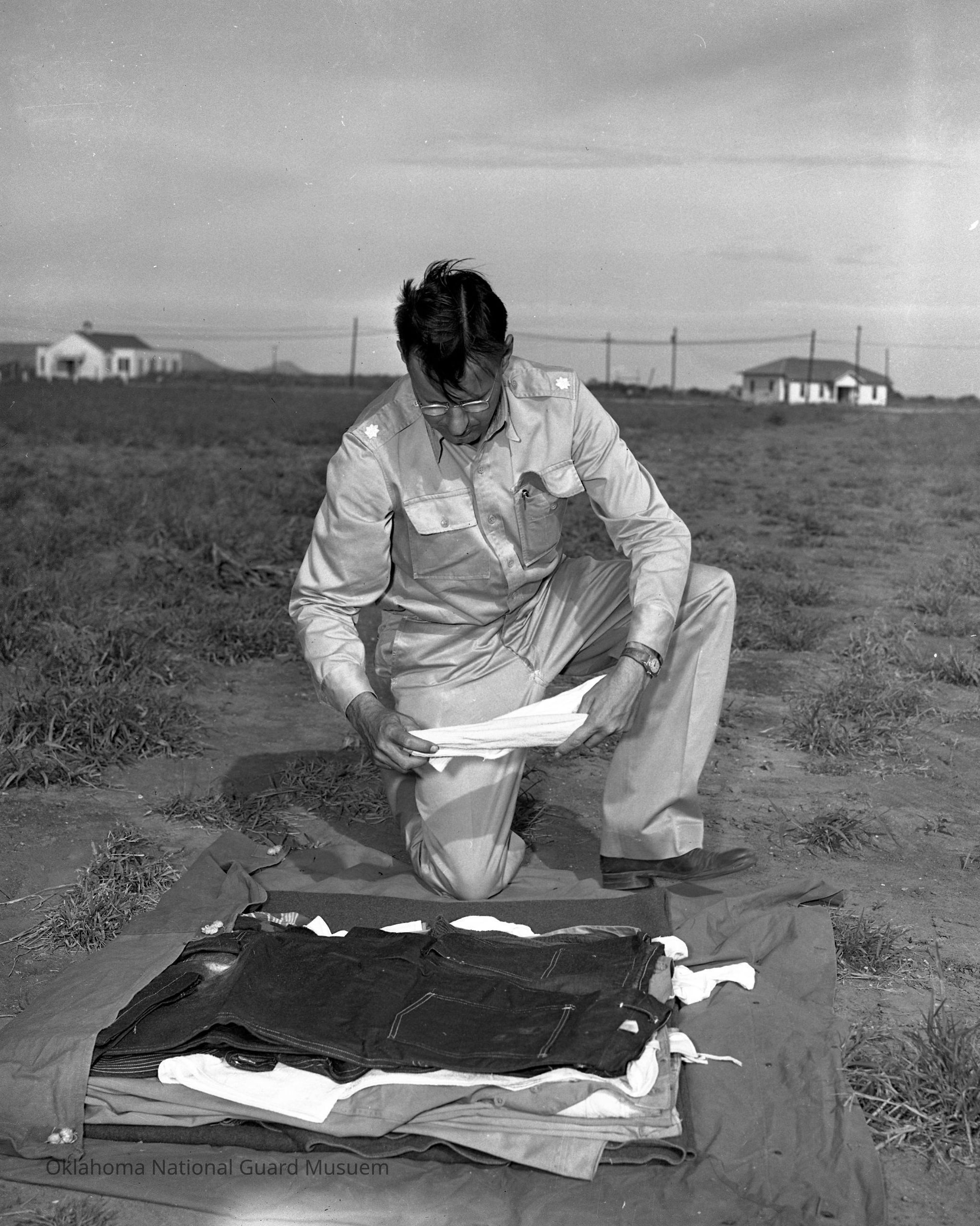 Negative Lt. Col. Francis J. Reichmann examining a stack of clothing