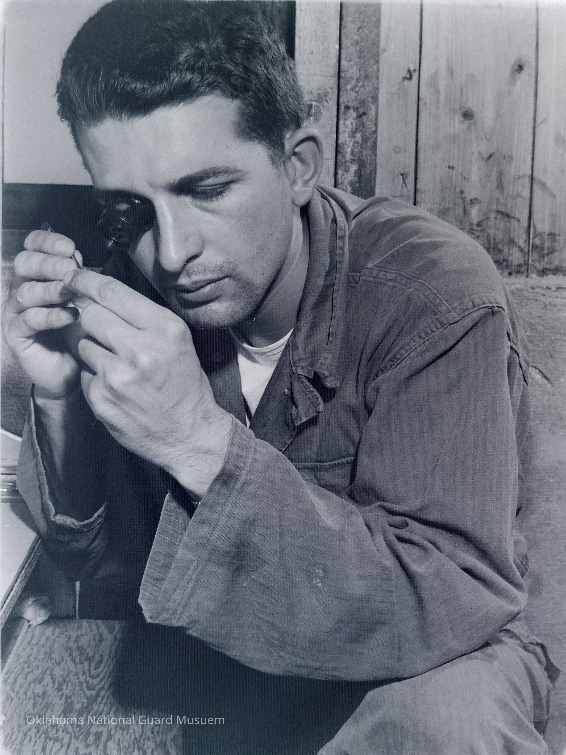 Soldier examining a very small object with a loupe