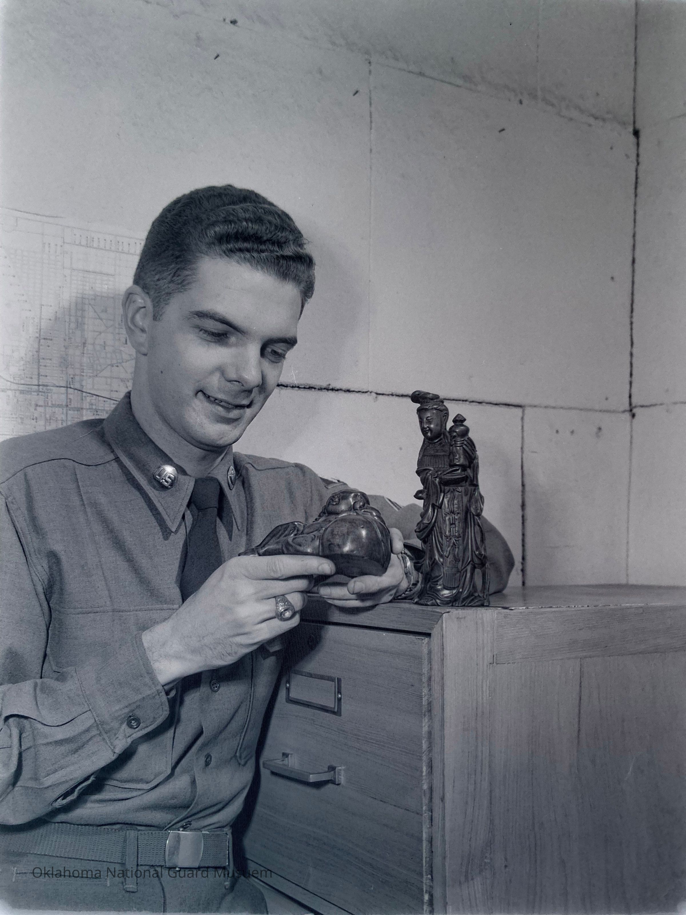 Negative of a soldier examining carved Japanese figurines on Hokkaido, Japan