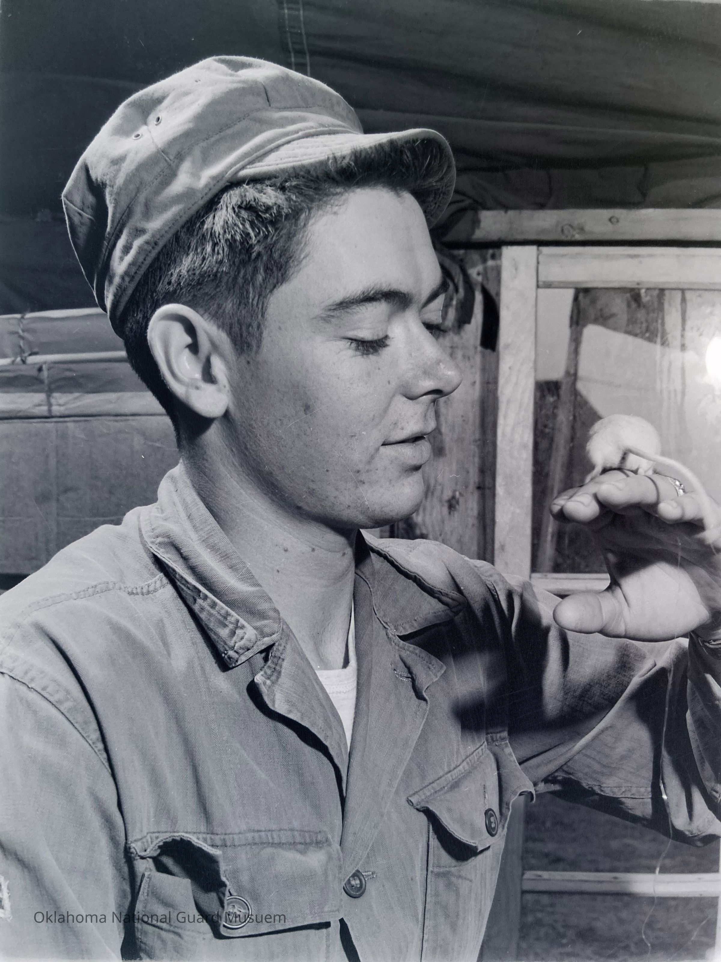 Soldier examining mouse on his hand