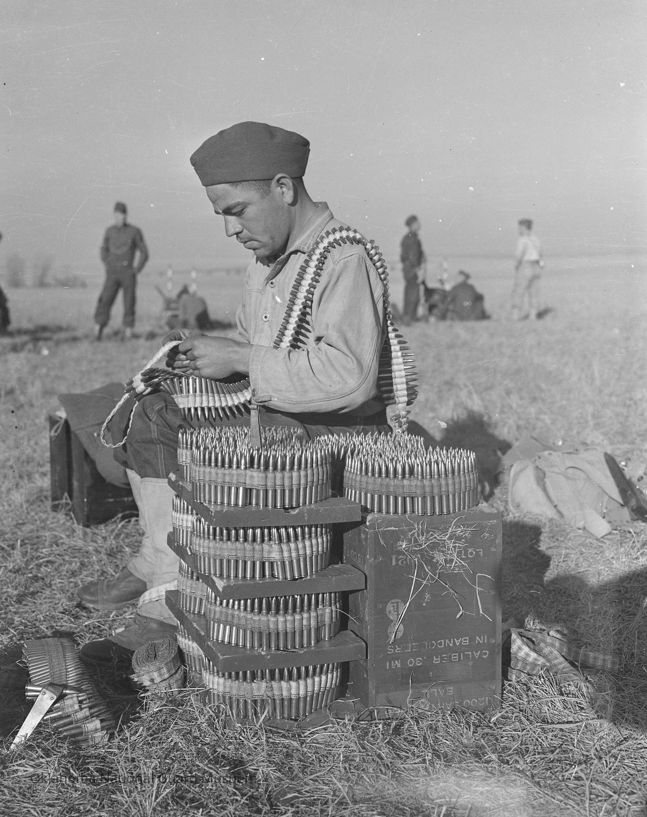 Negative of a soldier fitting ammunition into machine gun bandoliers