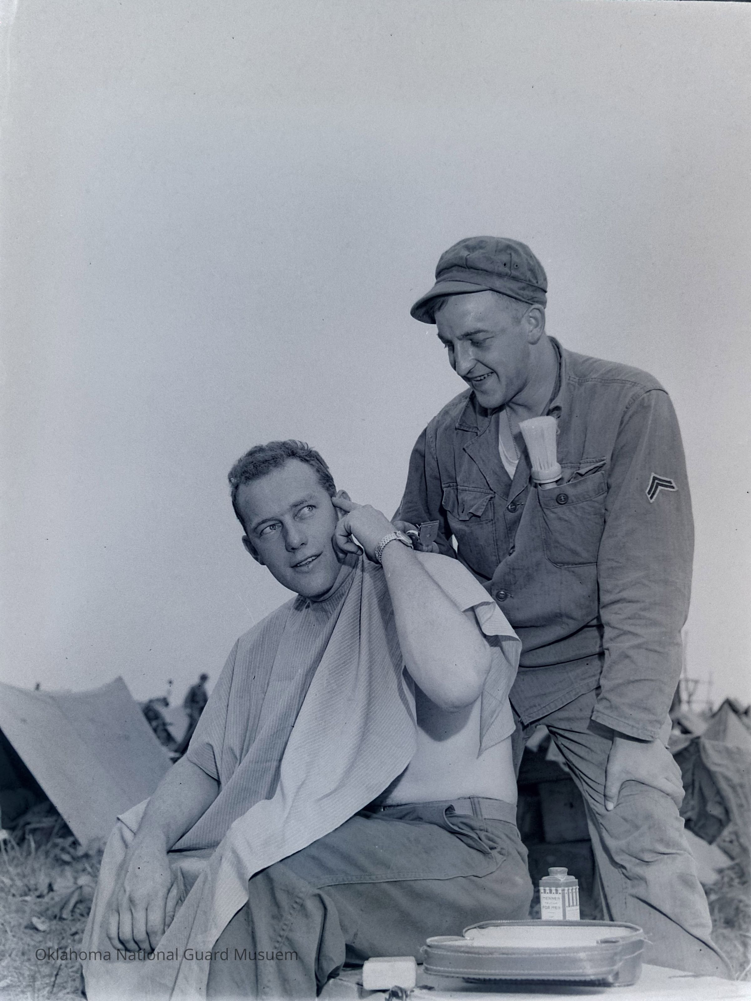 Negative of a soldier getting an outdoor haircut on Hokkaido, Japan