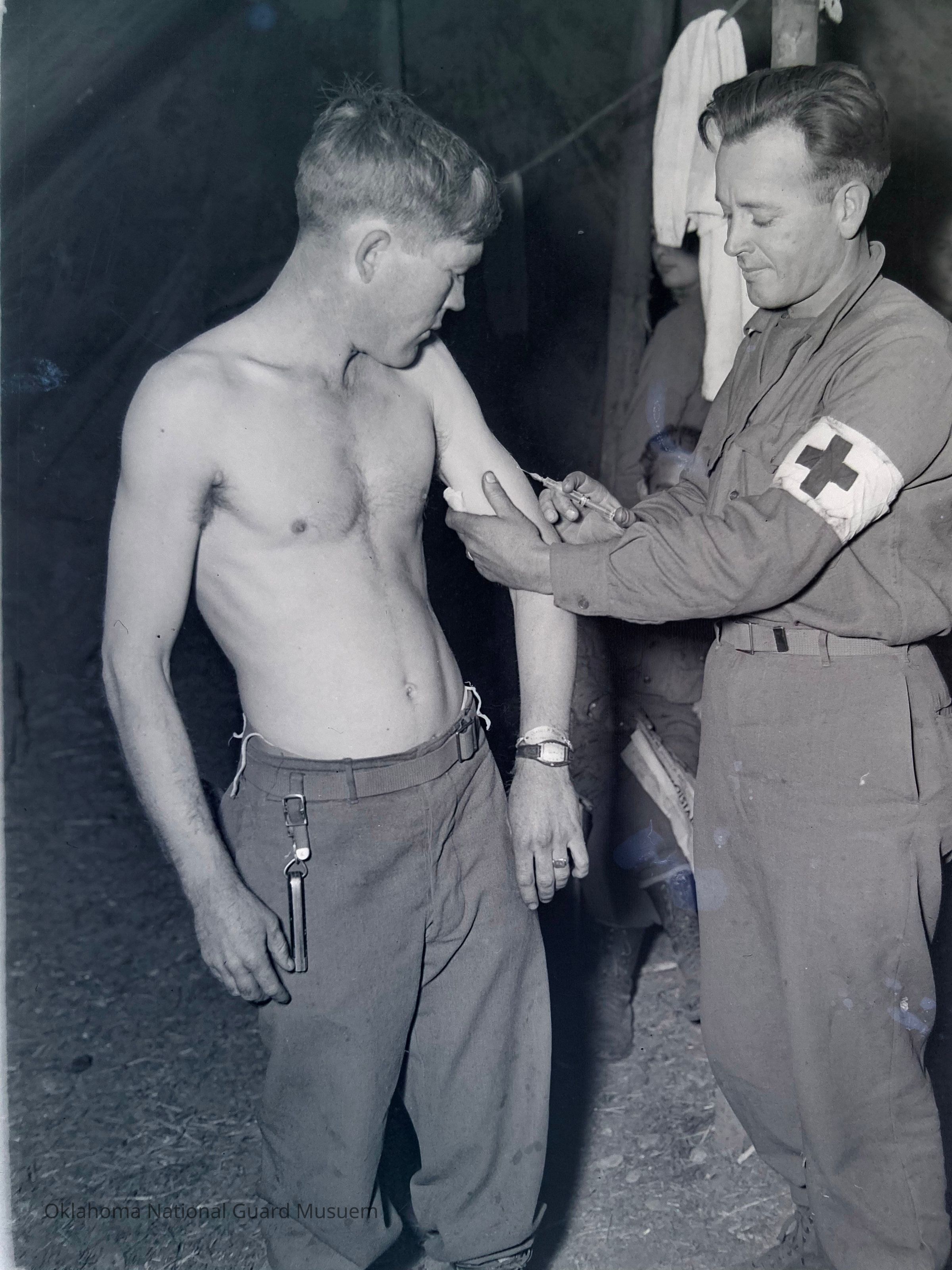 Negative of Randall Modes getting his Typhus vaccine from Clyde Bateman (Hugo, Oklahoma). 120th MedicalPhotograph Details