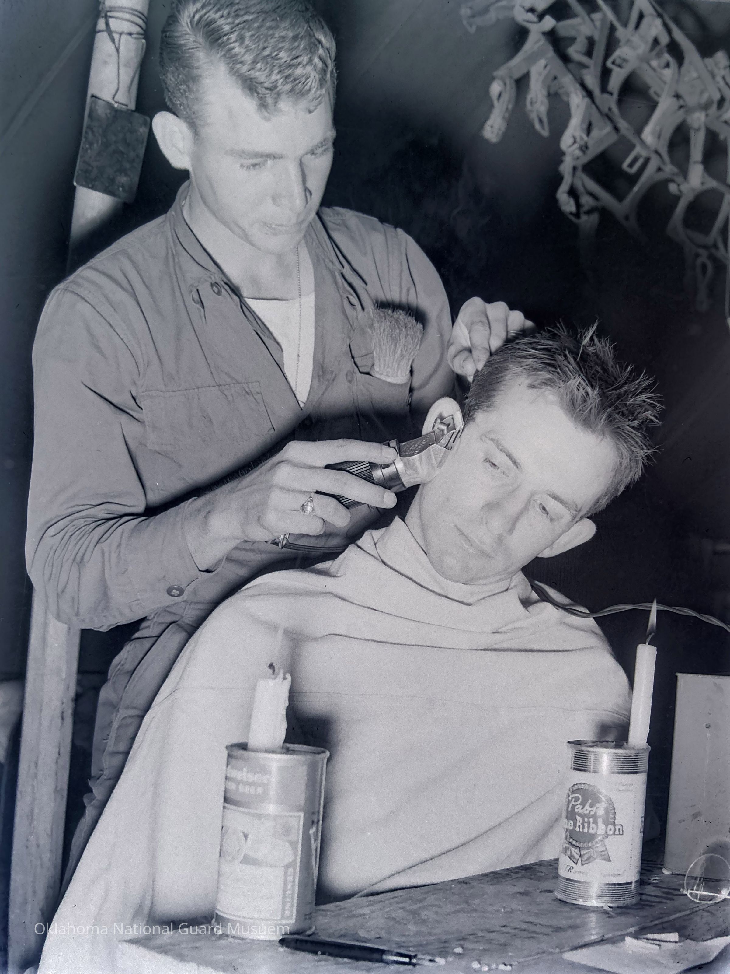 Soldier giving a haircut by candlelight