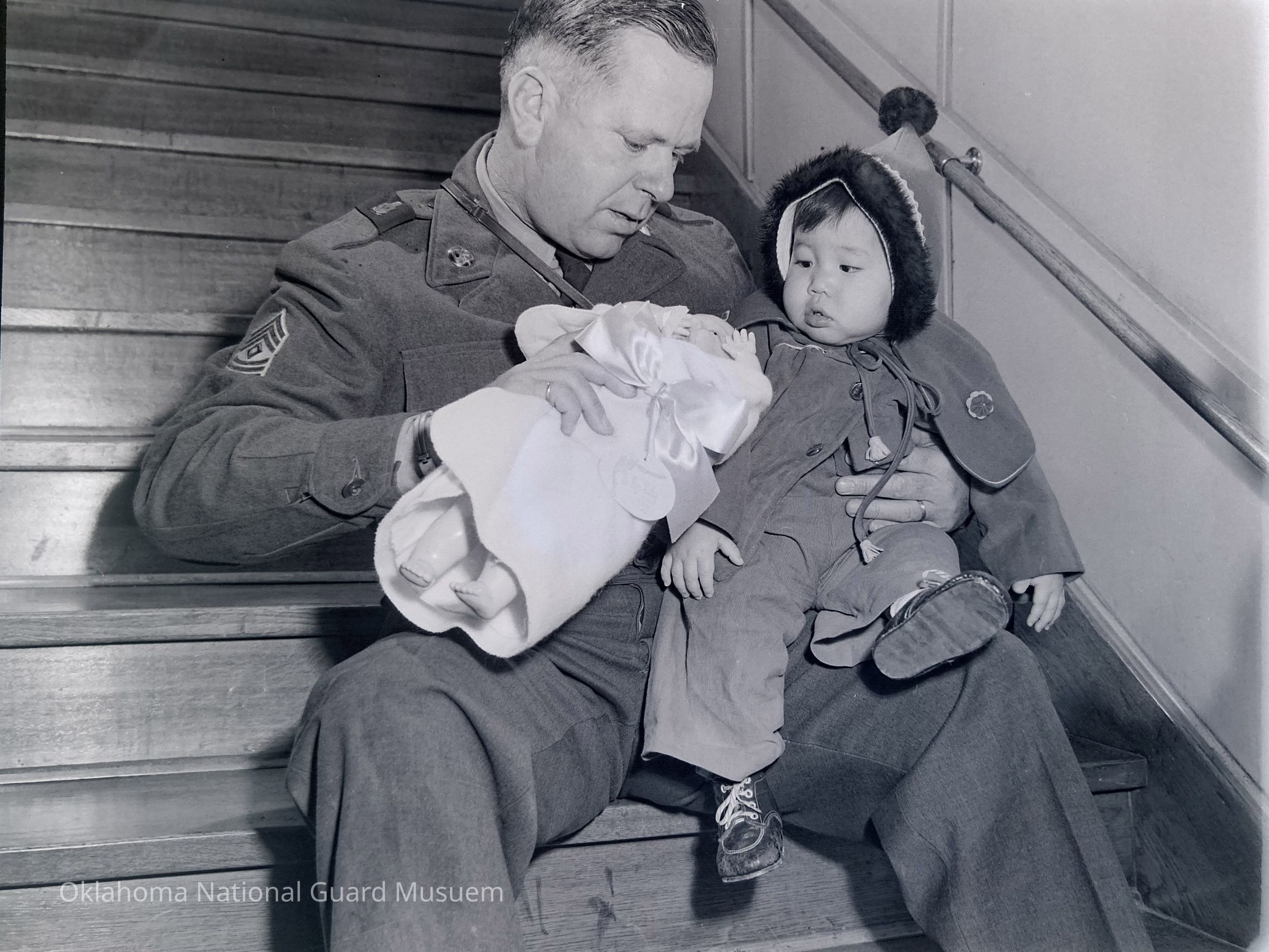 Negative of a soldier giving toys to a Japanese toddler on Hokkaido, Japan