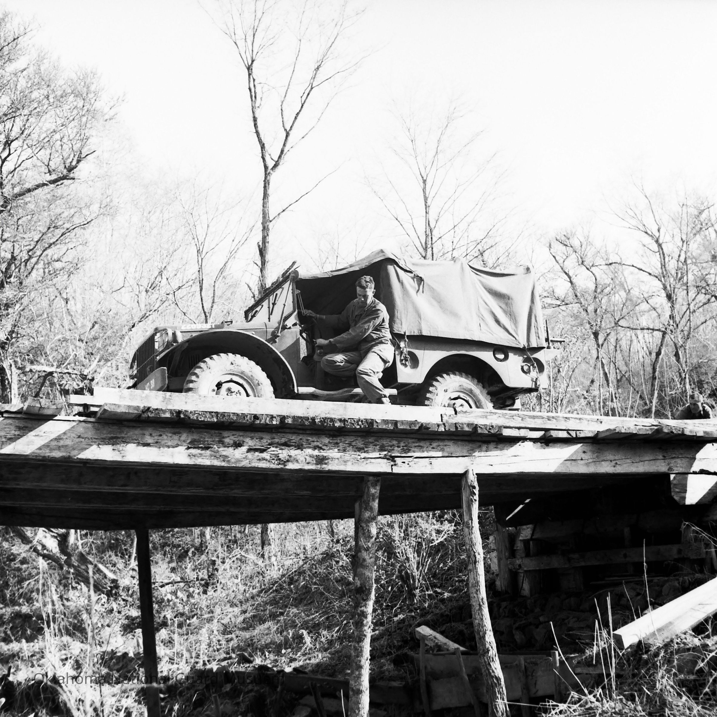 Negative of a soldier guiding a truck over wooden bridge