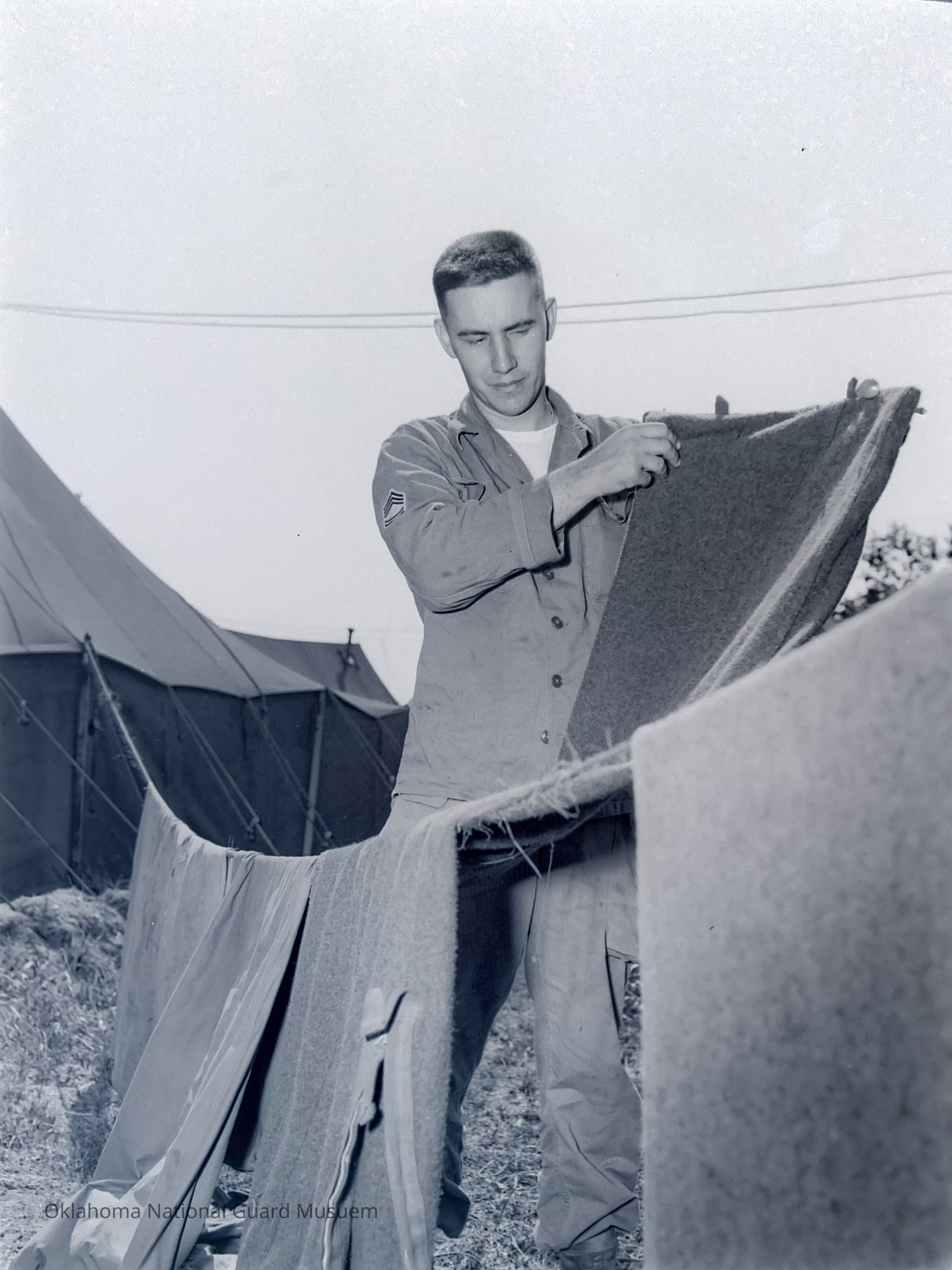 Soldier hanging laundry outside tent