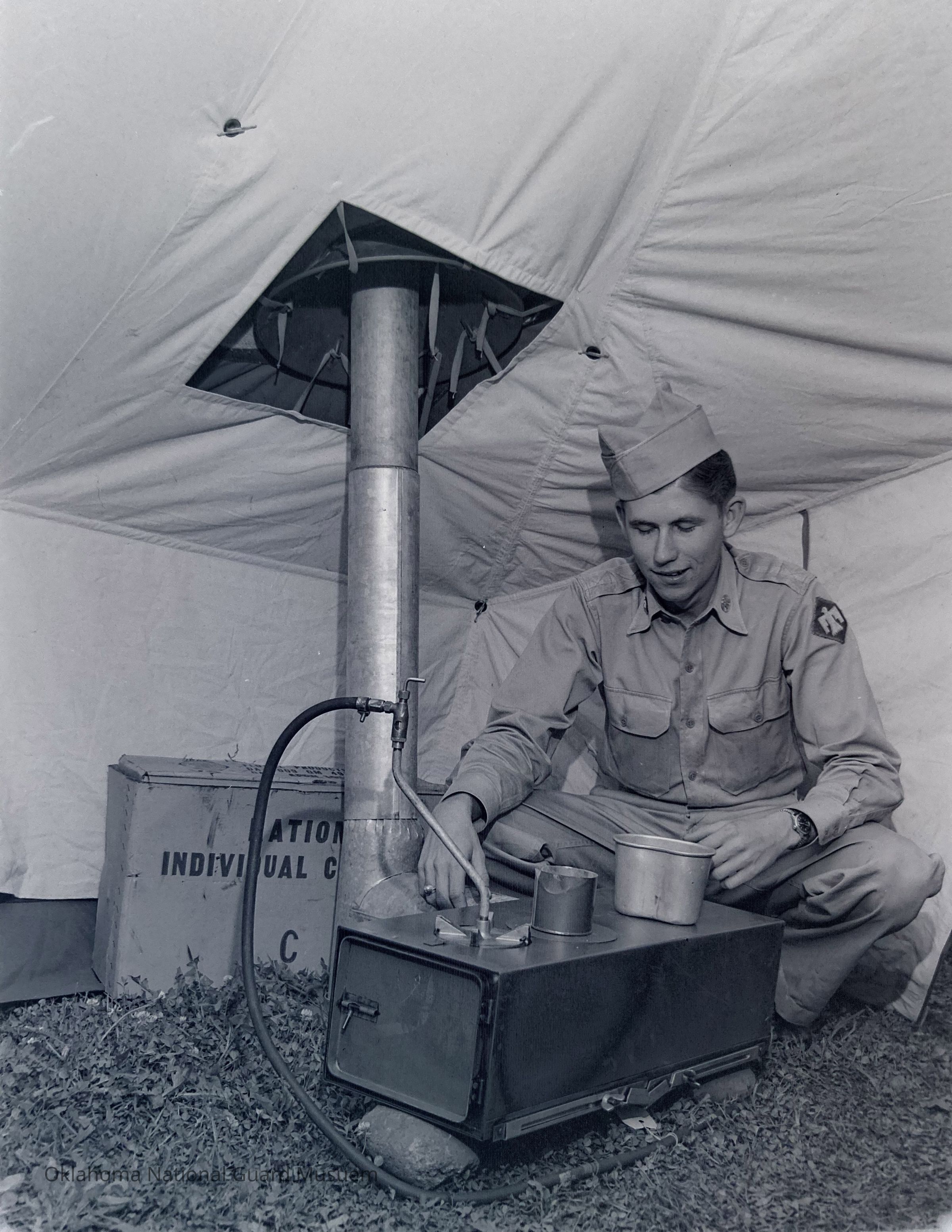 Soldier heating up rations on tent stoveEntry/Object ID