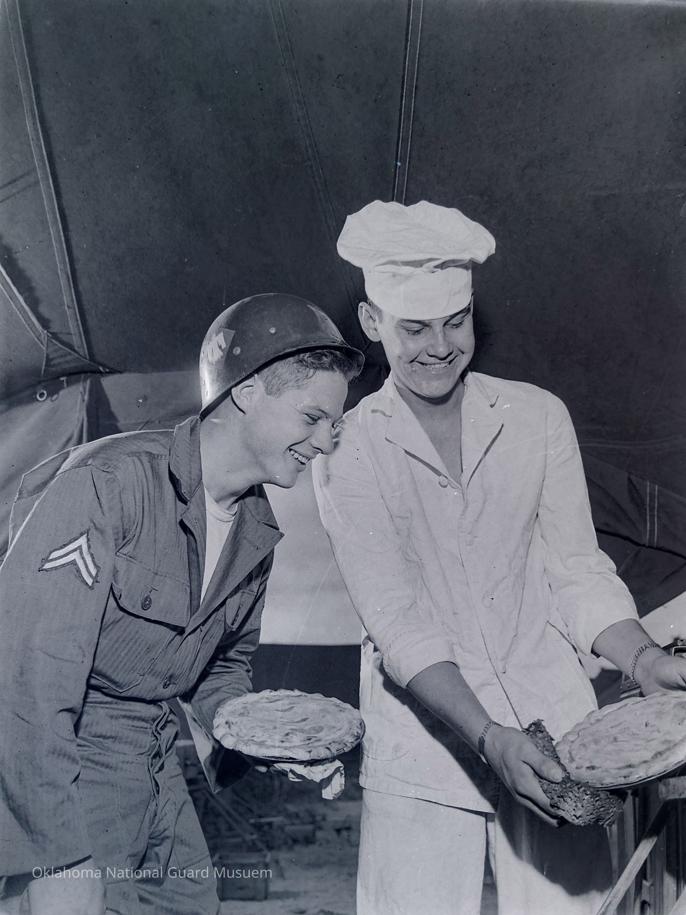 Negative of a soldier helping a cook bake pies on Hokkaido, Japan
