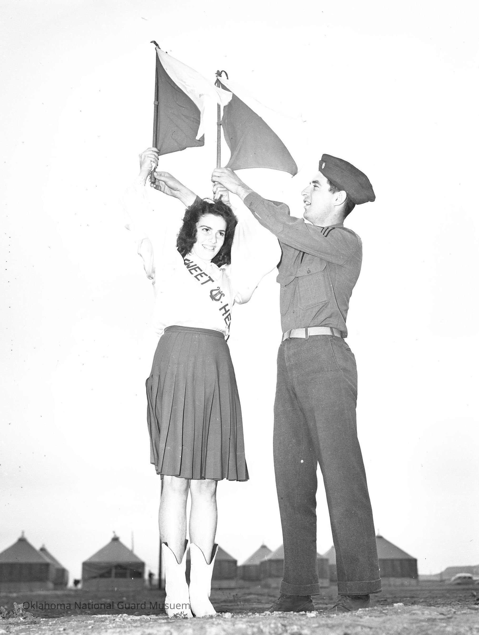 Negative of a soldier helping a woman wave signal flags