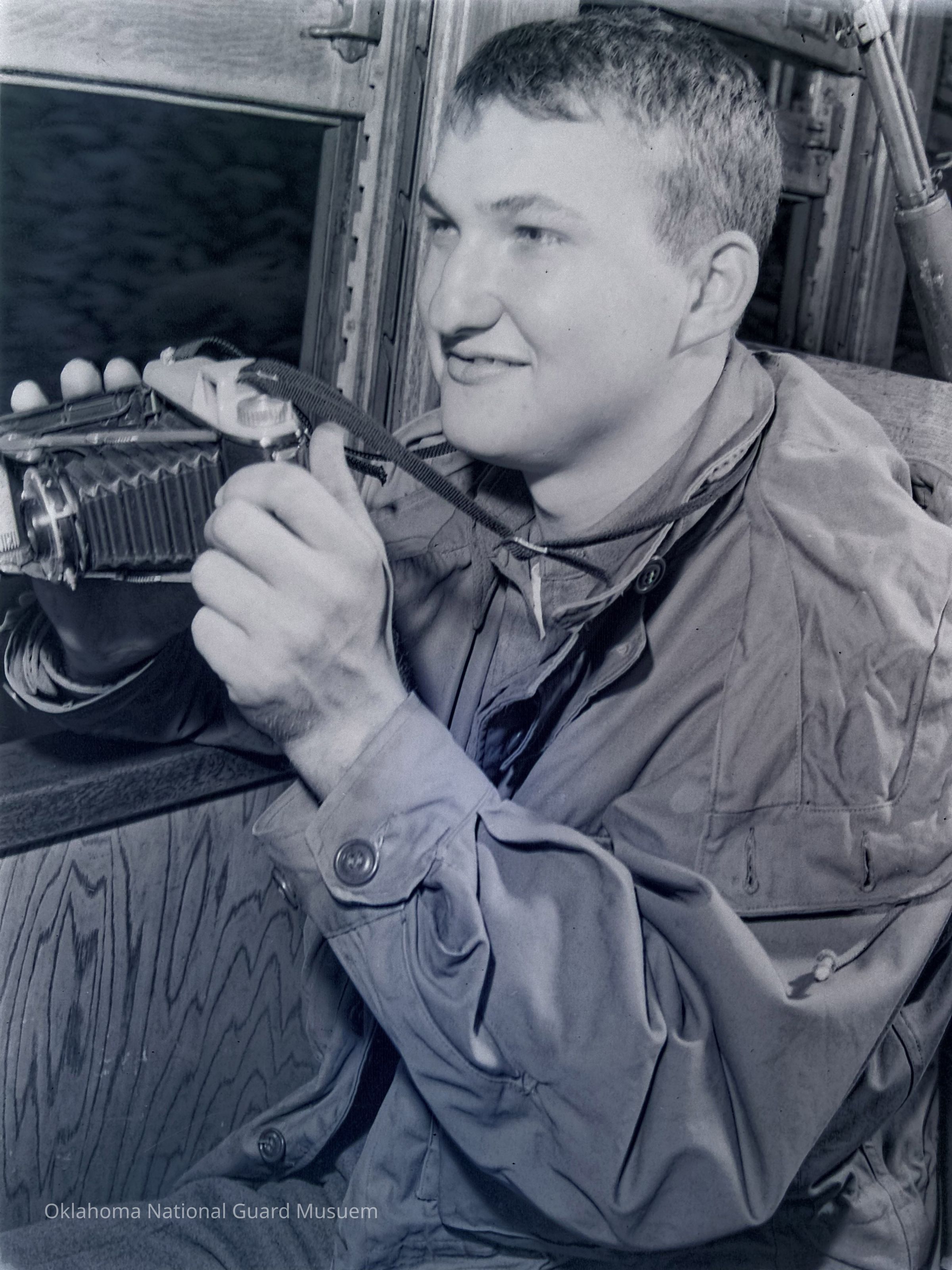 45th Division news Vol. Vi No. 38 "Arnold O. Schiefer, ready with his camera, looks at the new land from the train."