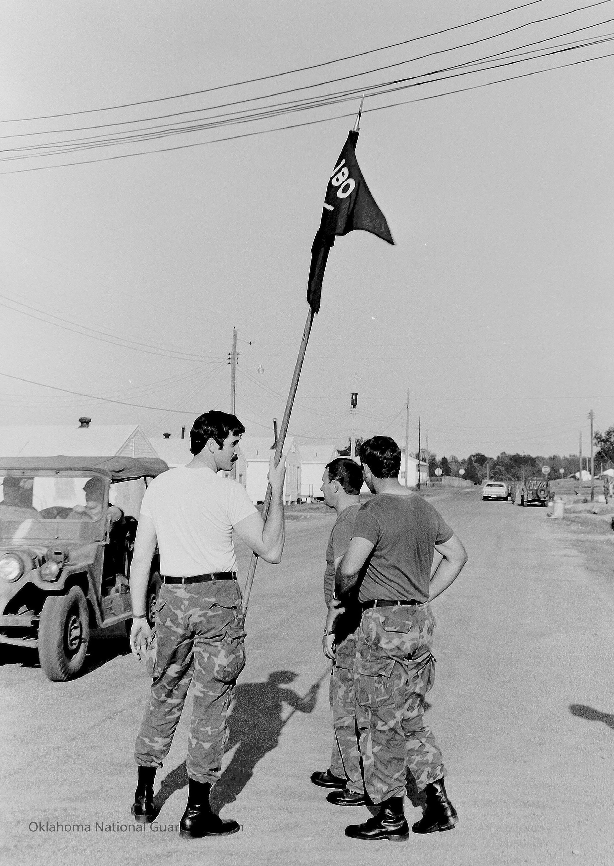 Soldier holding a guidon in camp area