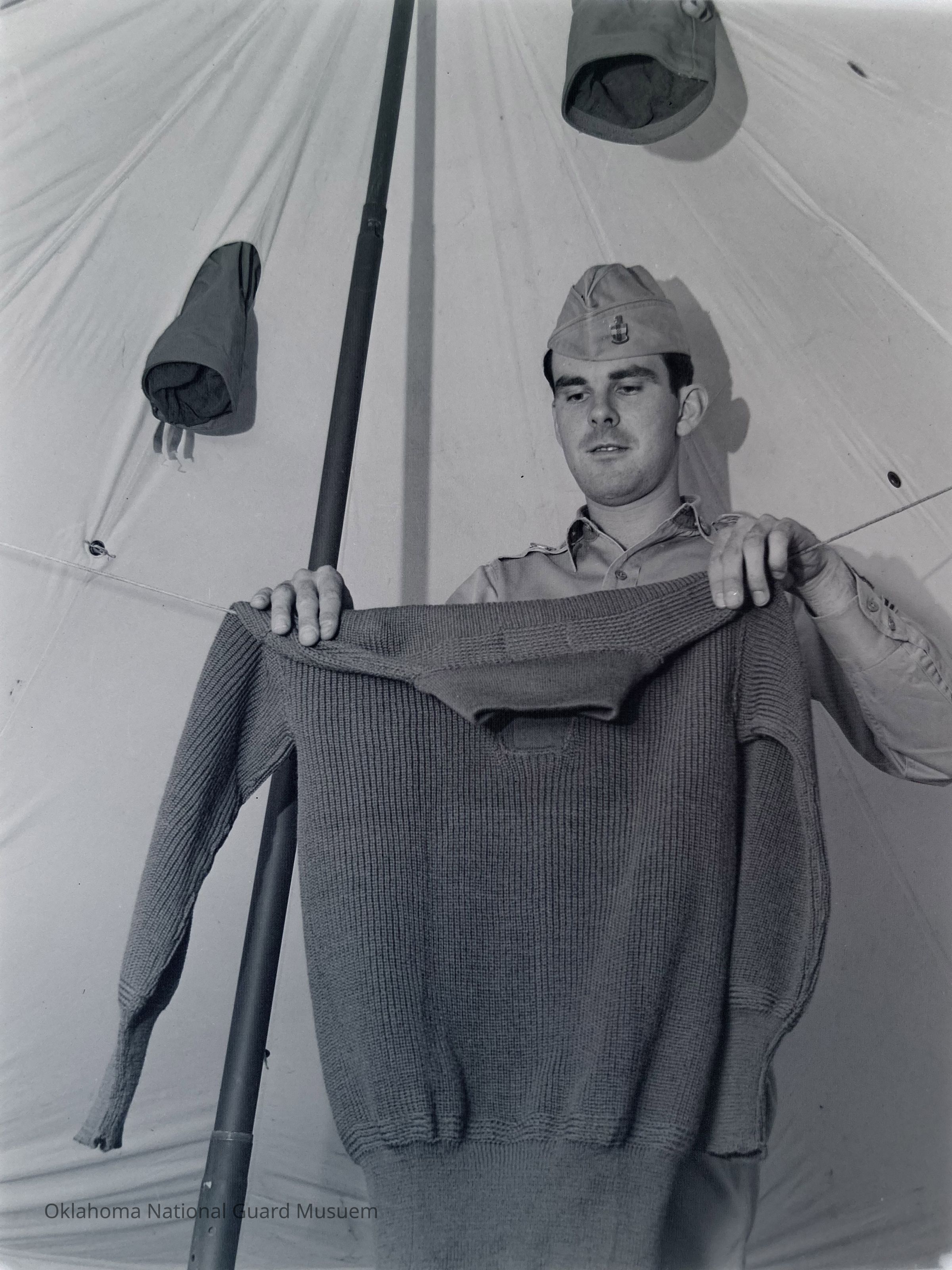 Negative of a soldier holding a sweater in a tent on Hokkaido, Japan