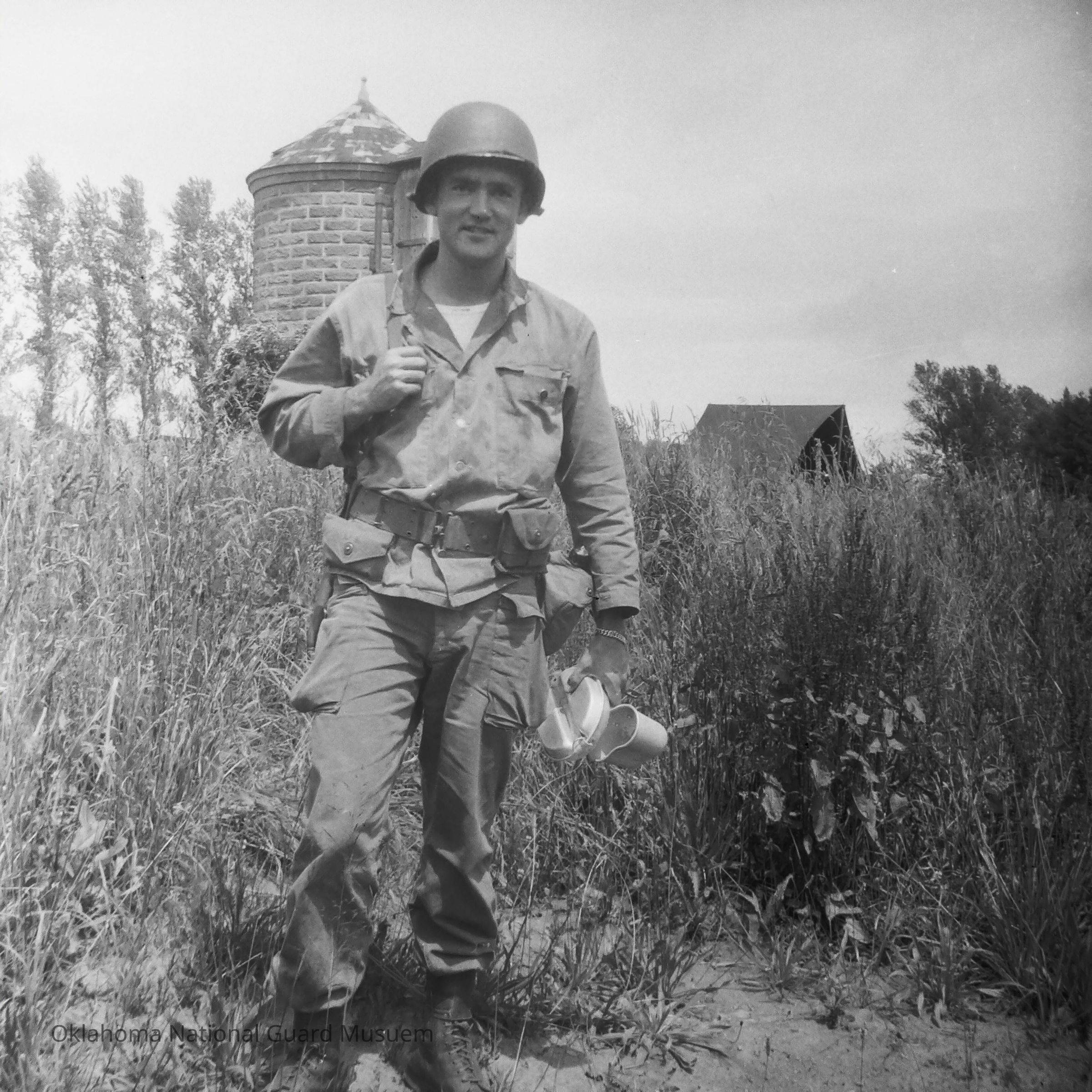 Negative of a soldier holding his mess gear with a silo and barn in the background