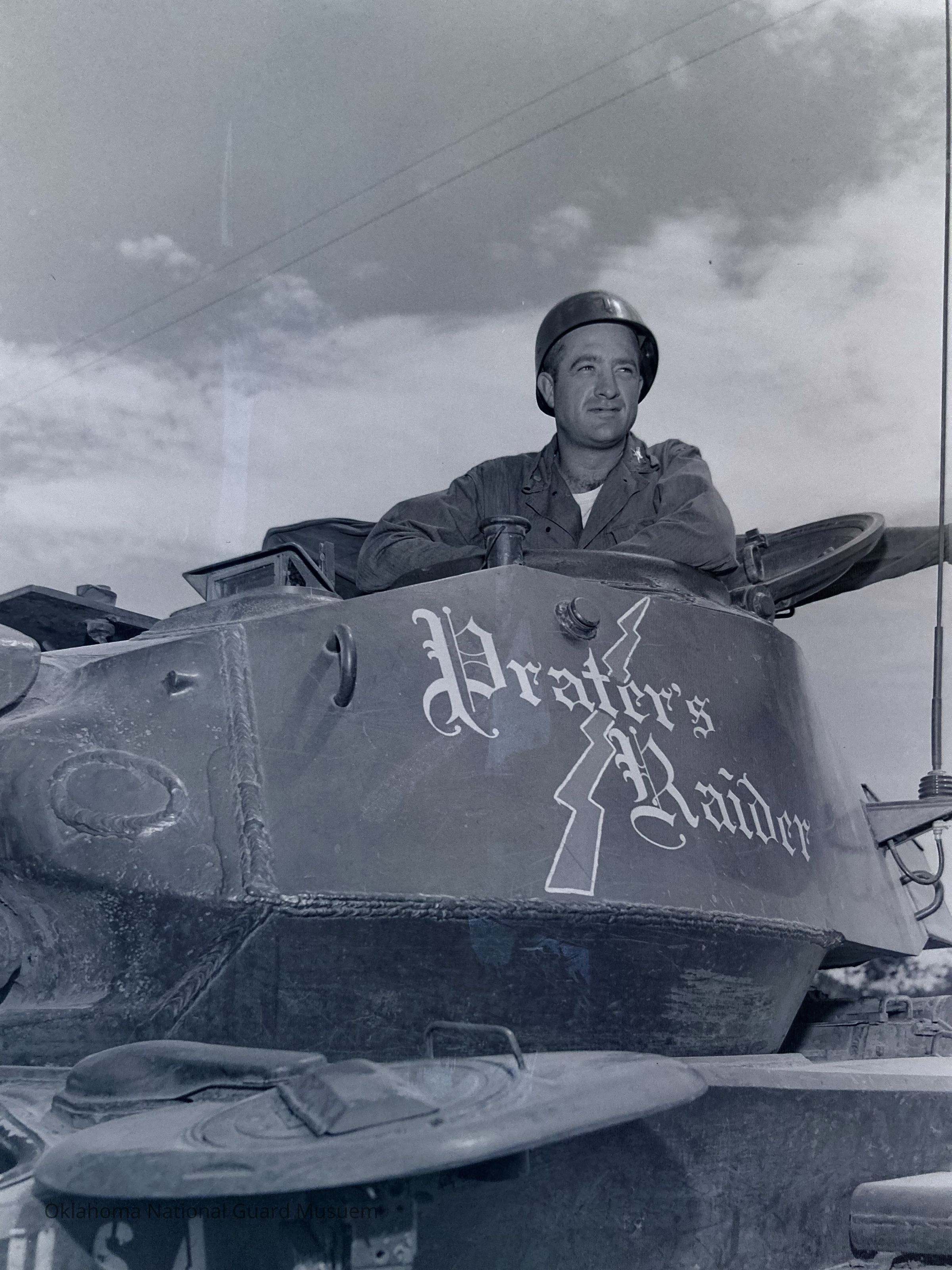 Soldier in a tank turret emblazoned with "Prater's Raider"