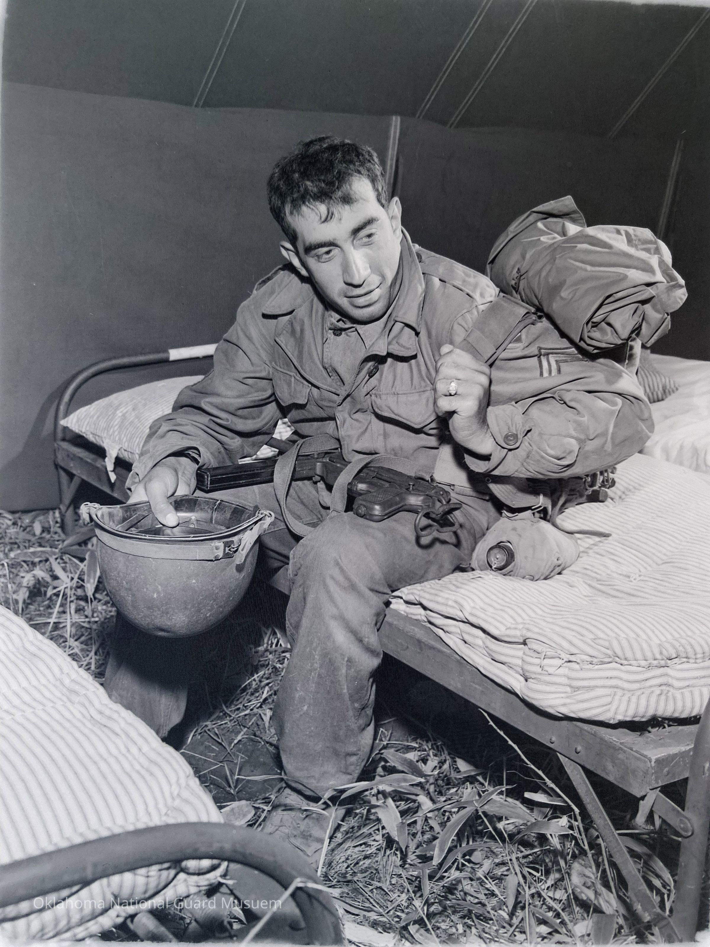 Negative of a soldier in field gear sitting on a cot in a tent on Hokkaido, Japan