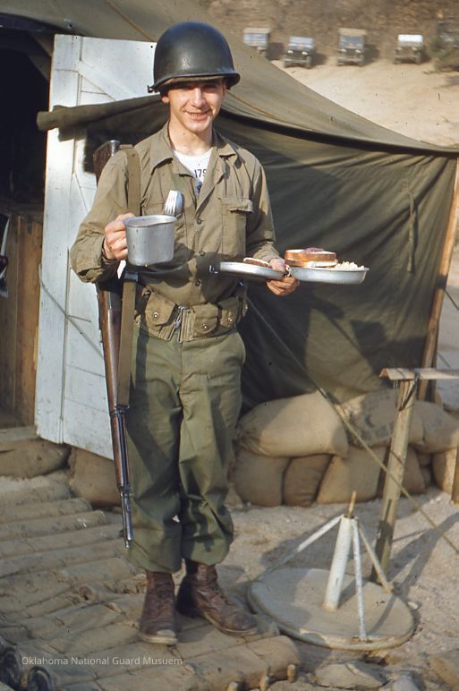 Soldier in front of tent with his mess kit full of food. 179th Infantry