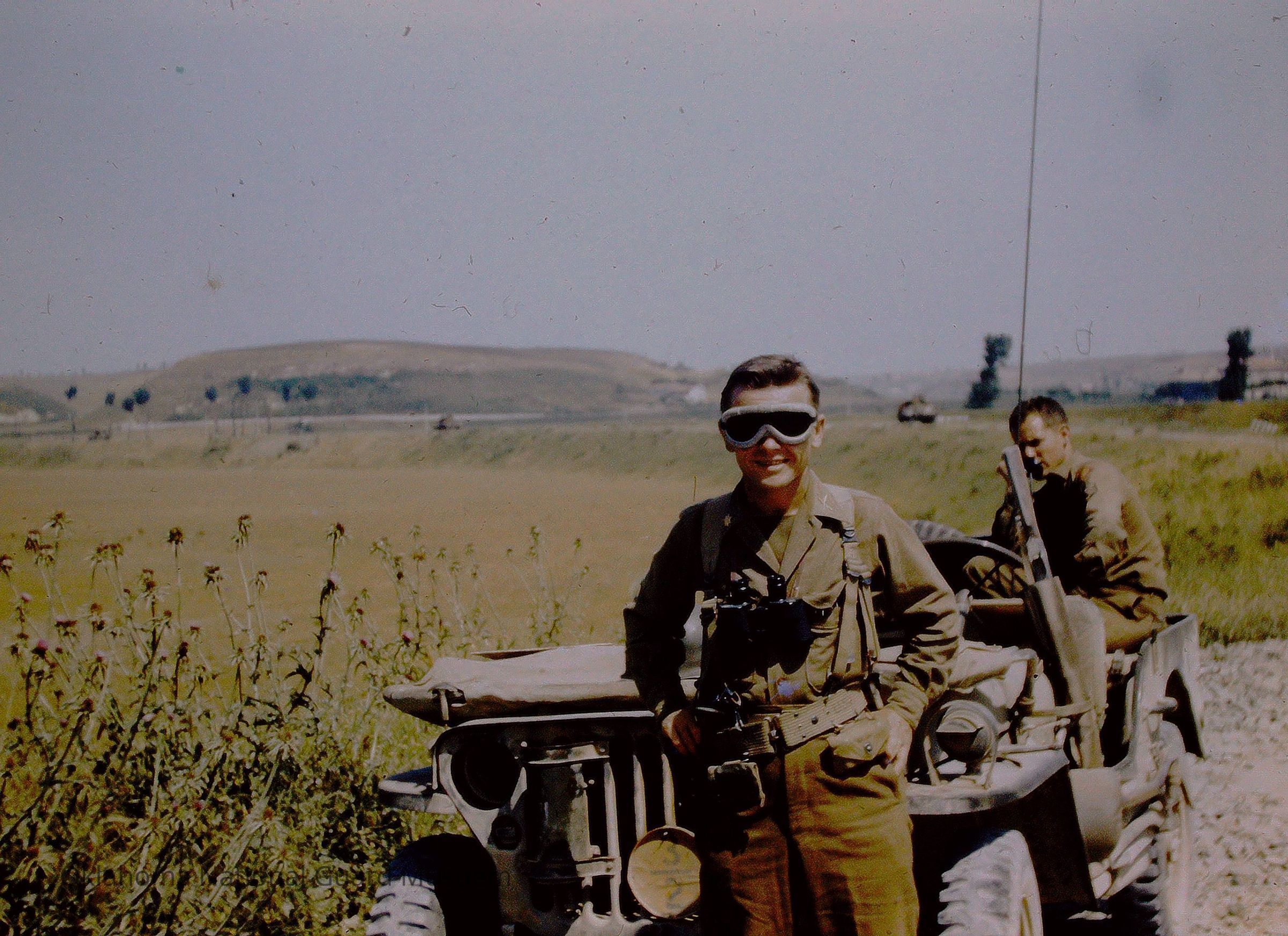 Kirk A. Meaders, 180th Infantry, poses in front of a jeep in his goggles and binoculars
