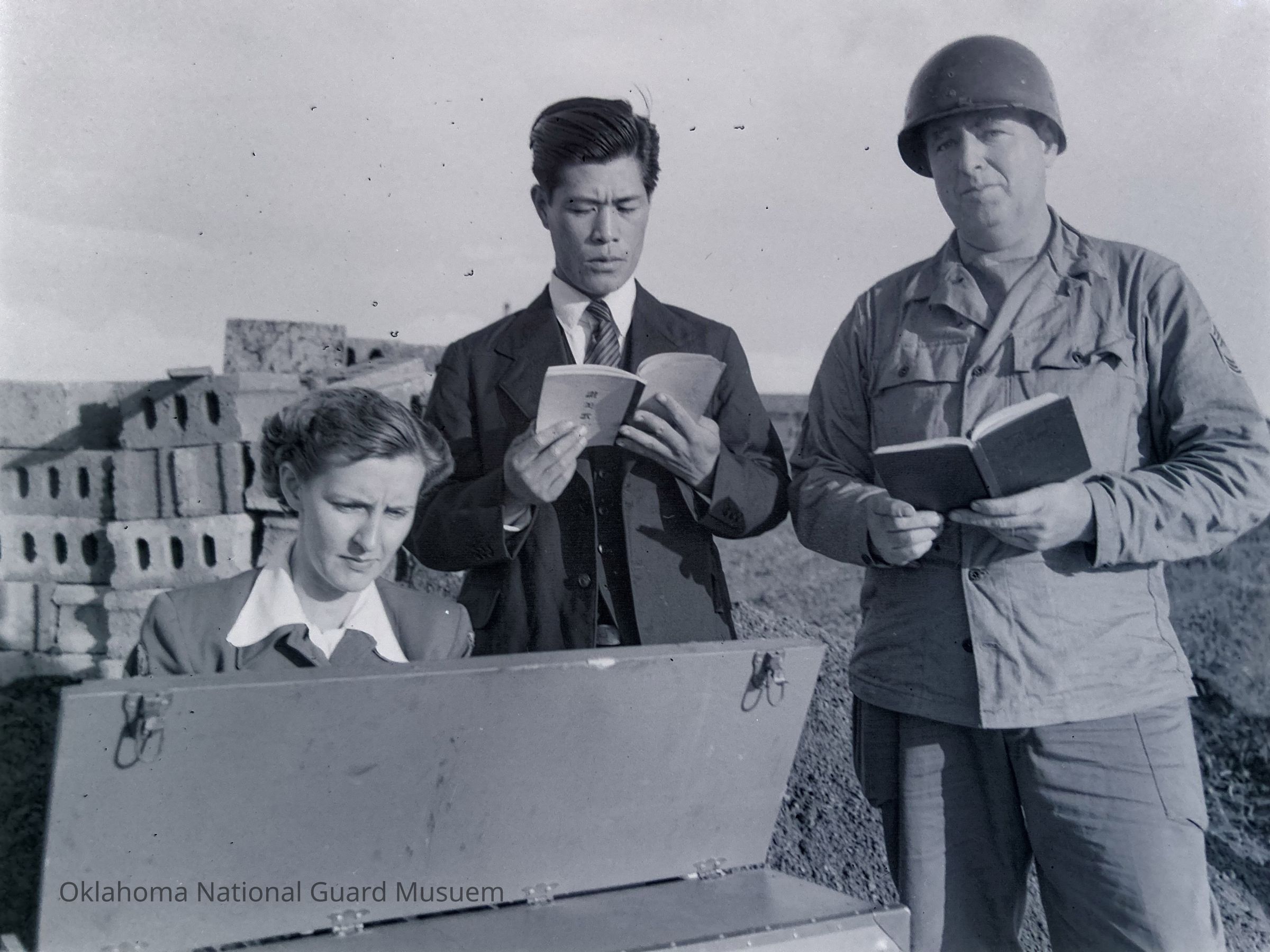 Negative of a soldier, Japanese man, and woman singing around a keyboard on Hokkaido, Japan