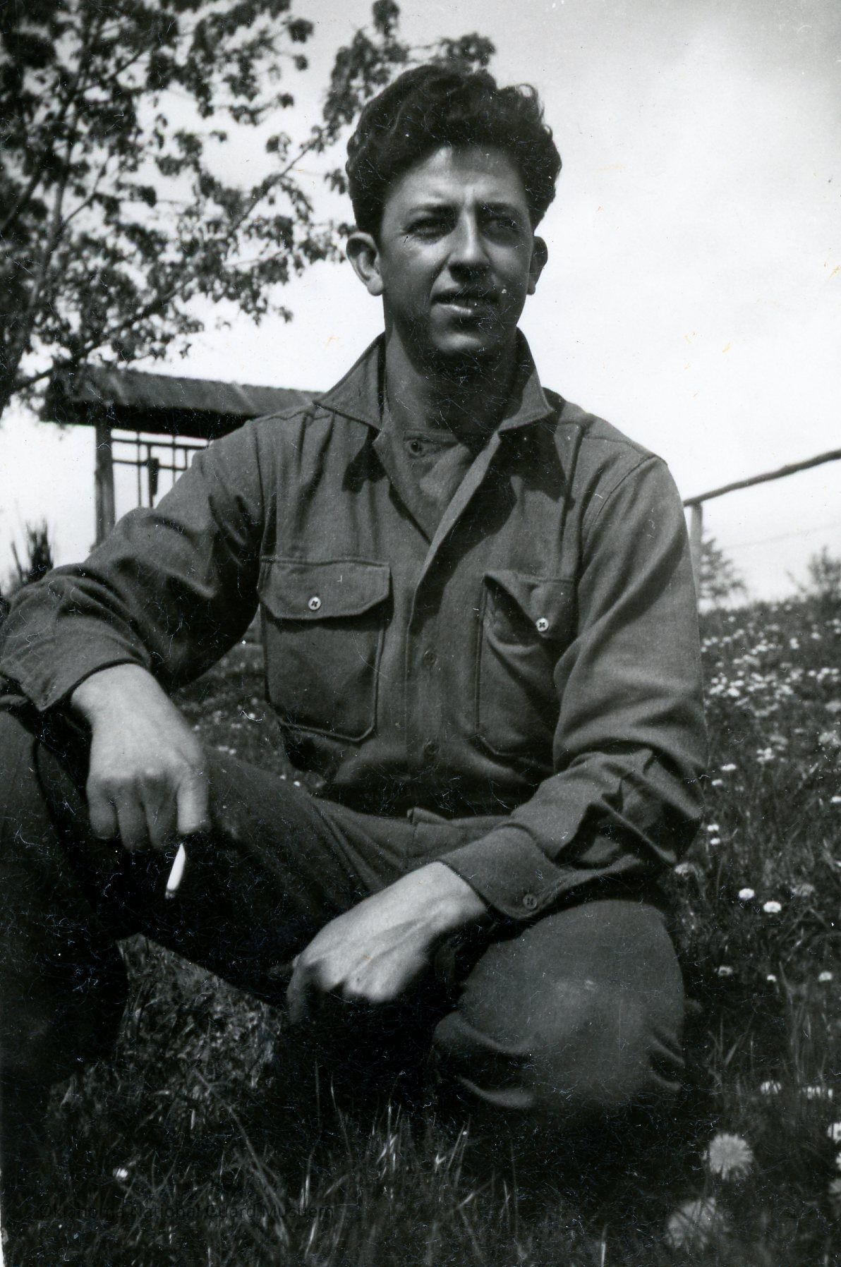 John Heinefelt kneeling in a field of flowers 160th Field Artillery. John Embry's driver