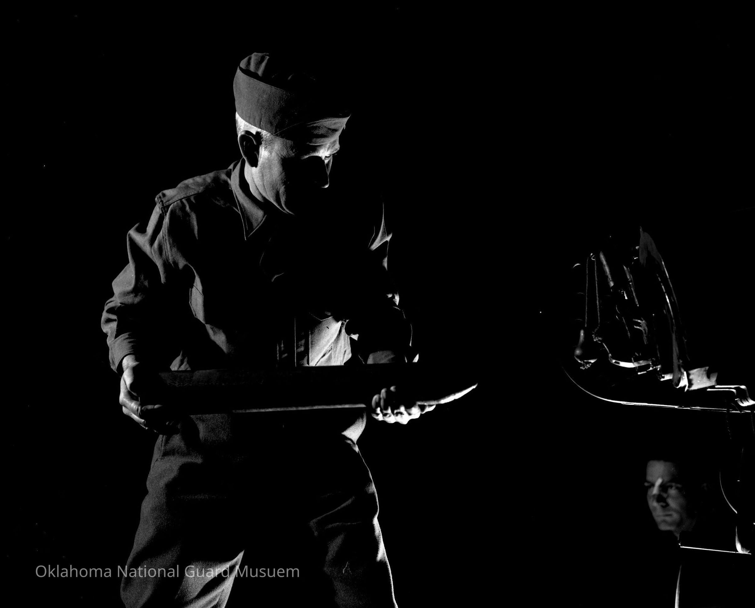 Negative of a soldier loading artillery shell into gun
