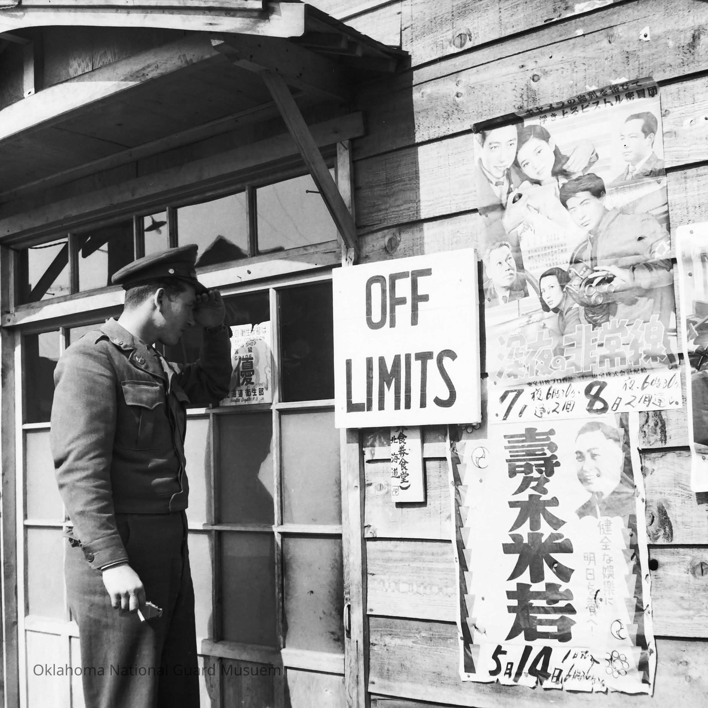 Negative of a soldier looking in the window of a building posted "Off Limits"