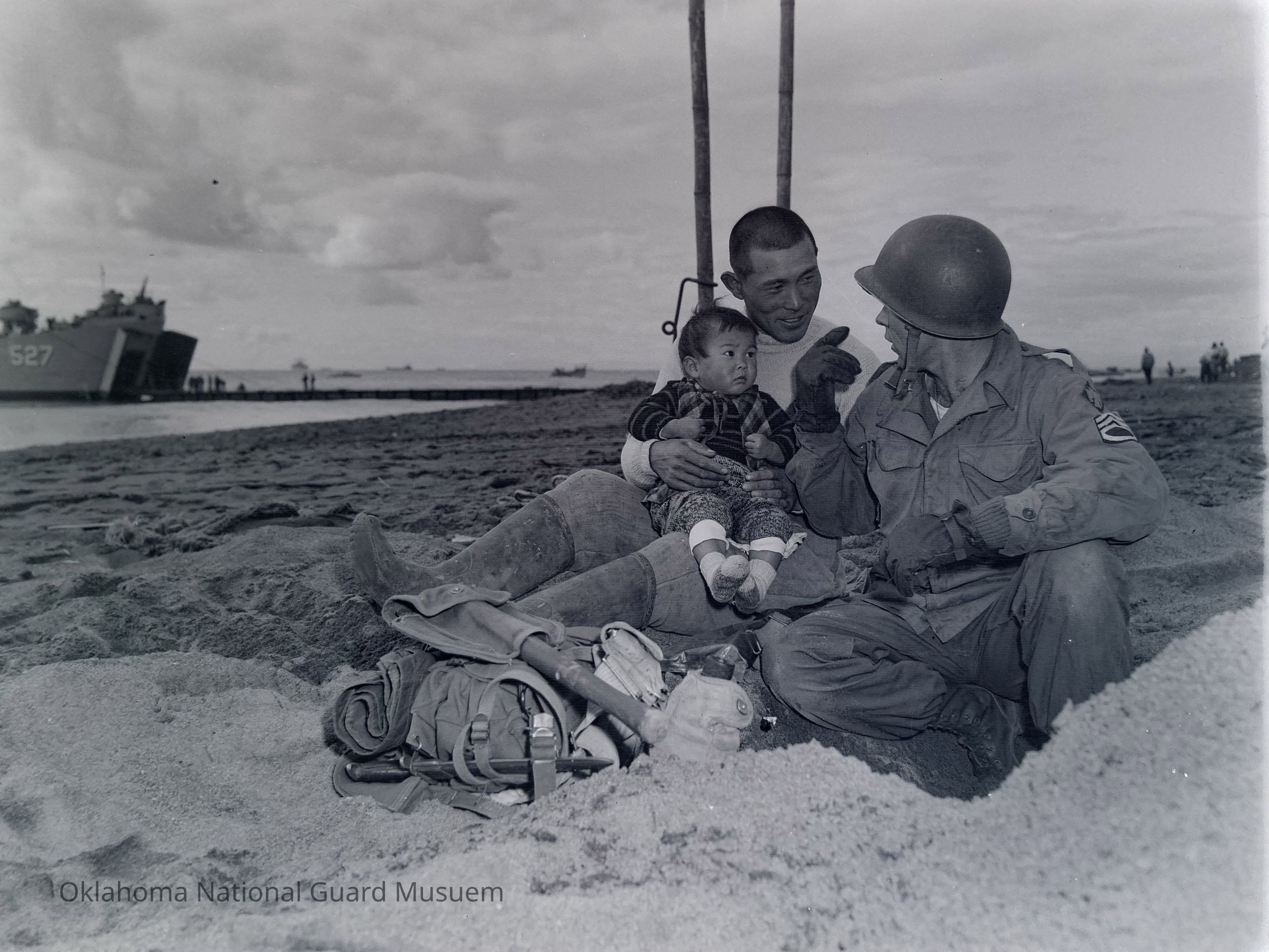 Negative of a soldier on beach talking with a Japanese father and child on Hokkaido, Japan