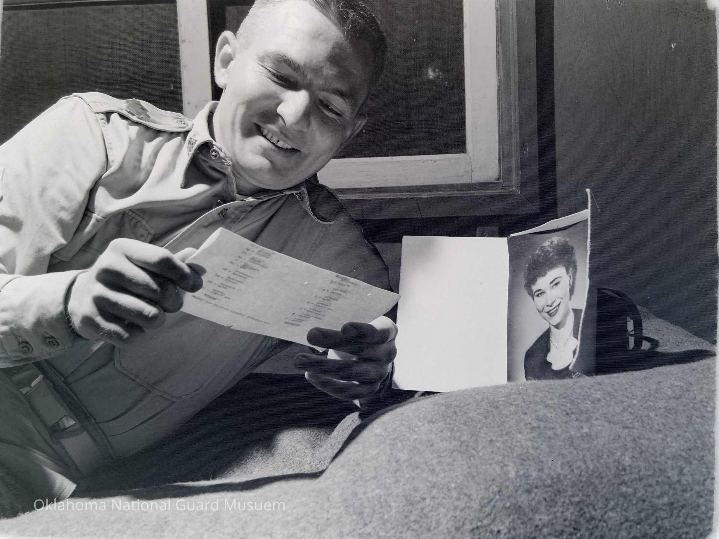 Negative of a soldier on bed reading with a picture of a girl on Hokkaido, Japan