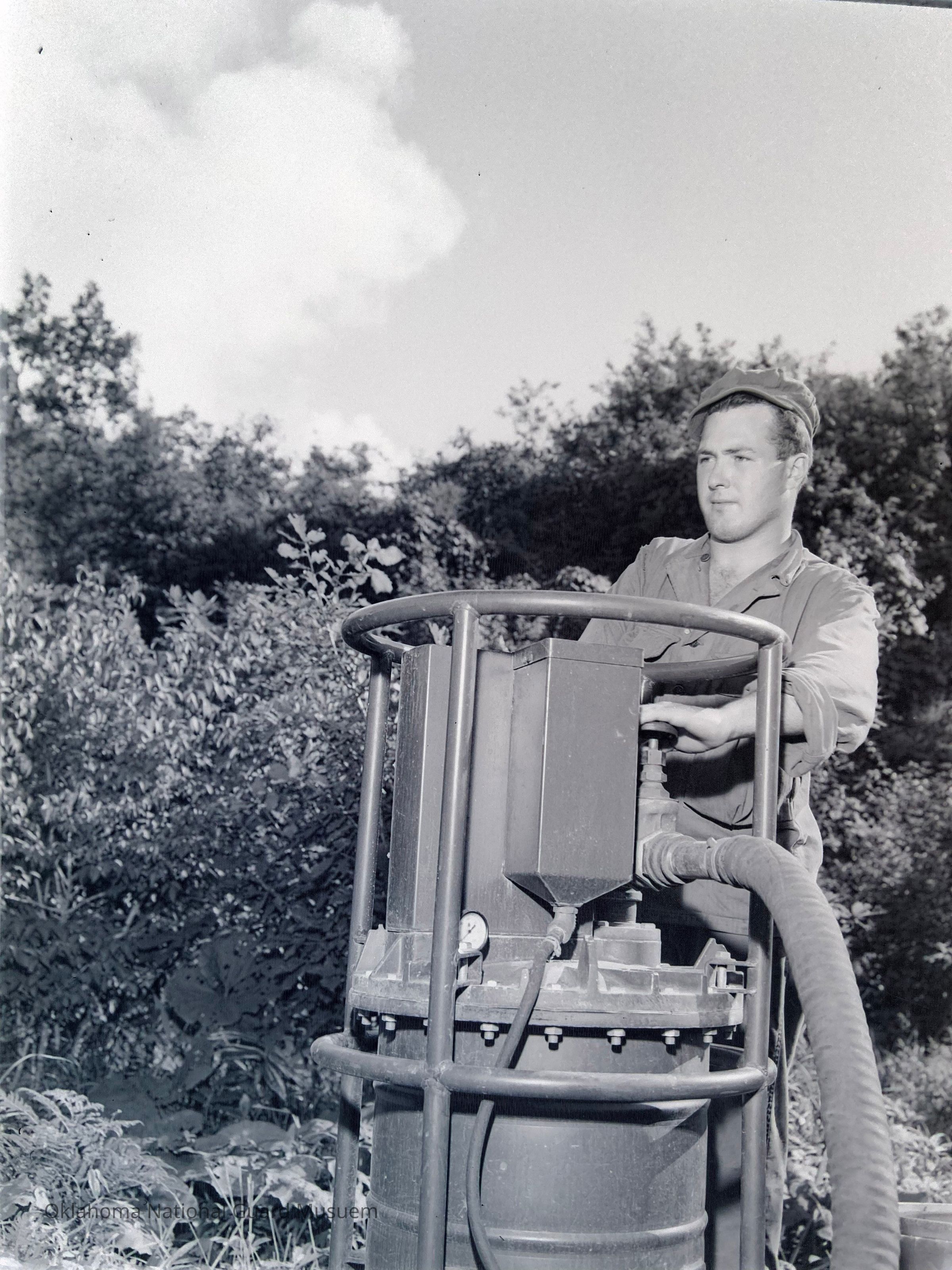 Negative of soldier operating a small water purification plant on Hokkaido, Japan
