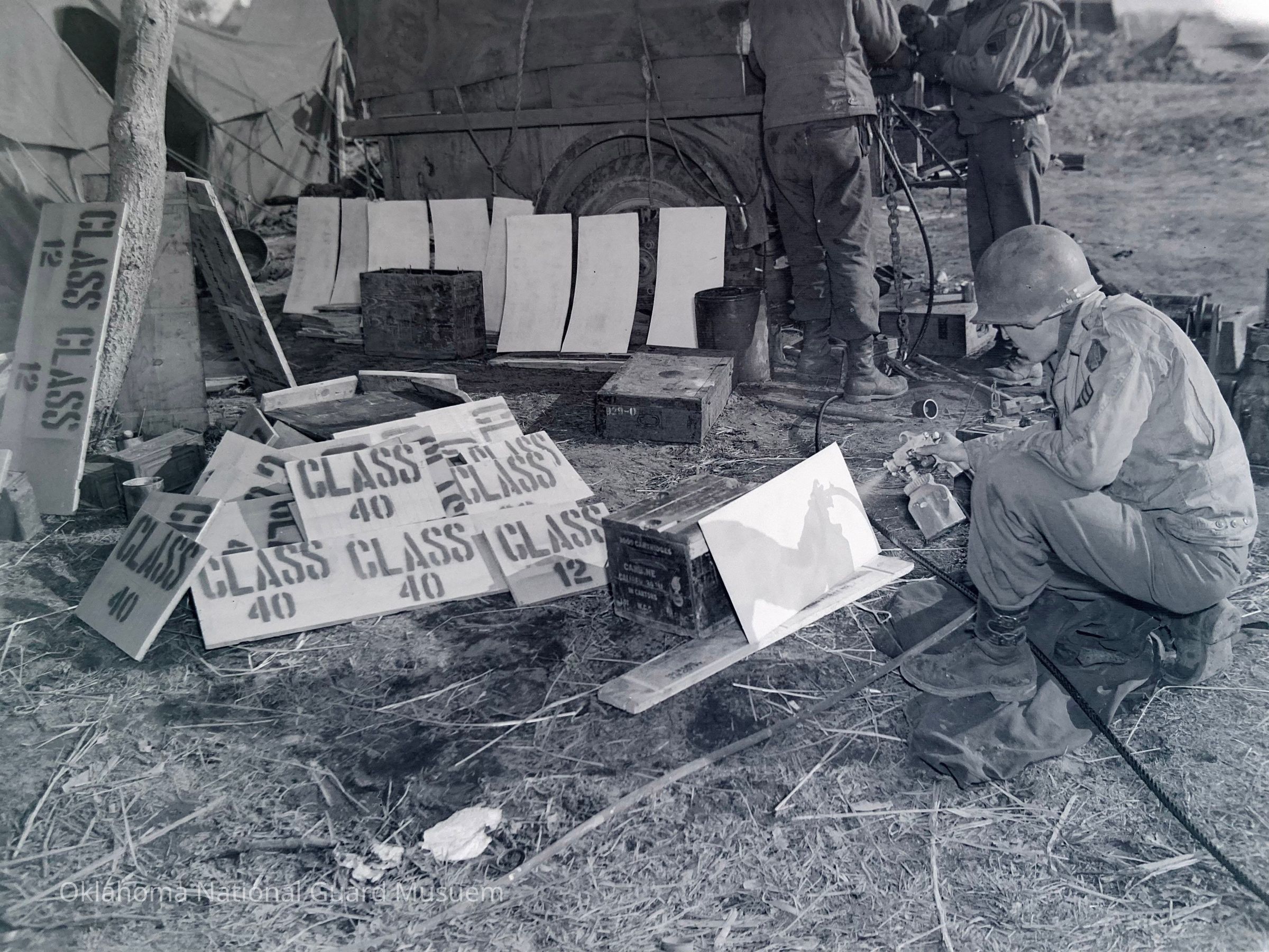 Photograph published in the 45th Division News, 22 February 1944, Vol. IV, No. 31, Caption "Sgt Jose Gonzales and his headache - white signs." Accompanying story "Artist Engineers Dread White Signs."