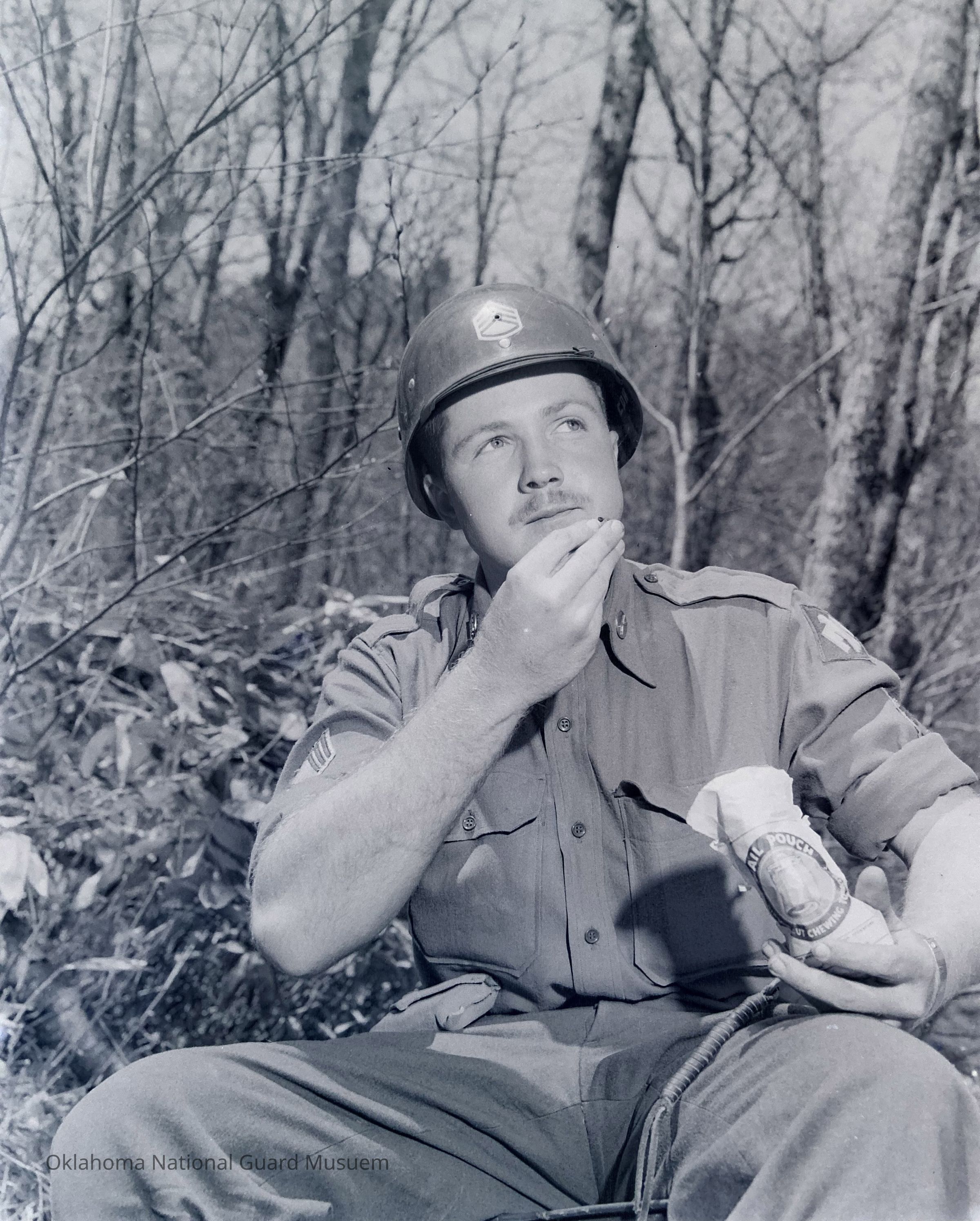 Negative of a soldier placing chewing tobacco in his mouth on Hokkaido, Japan