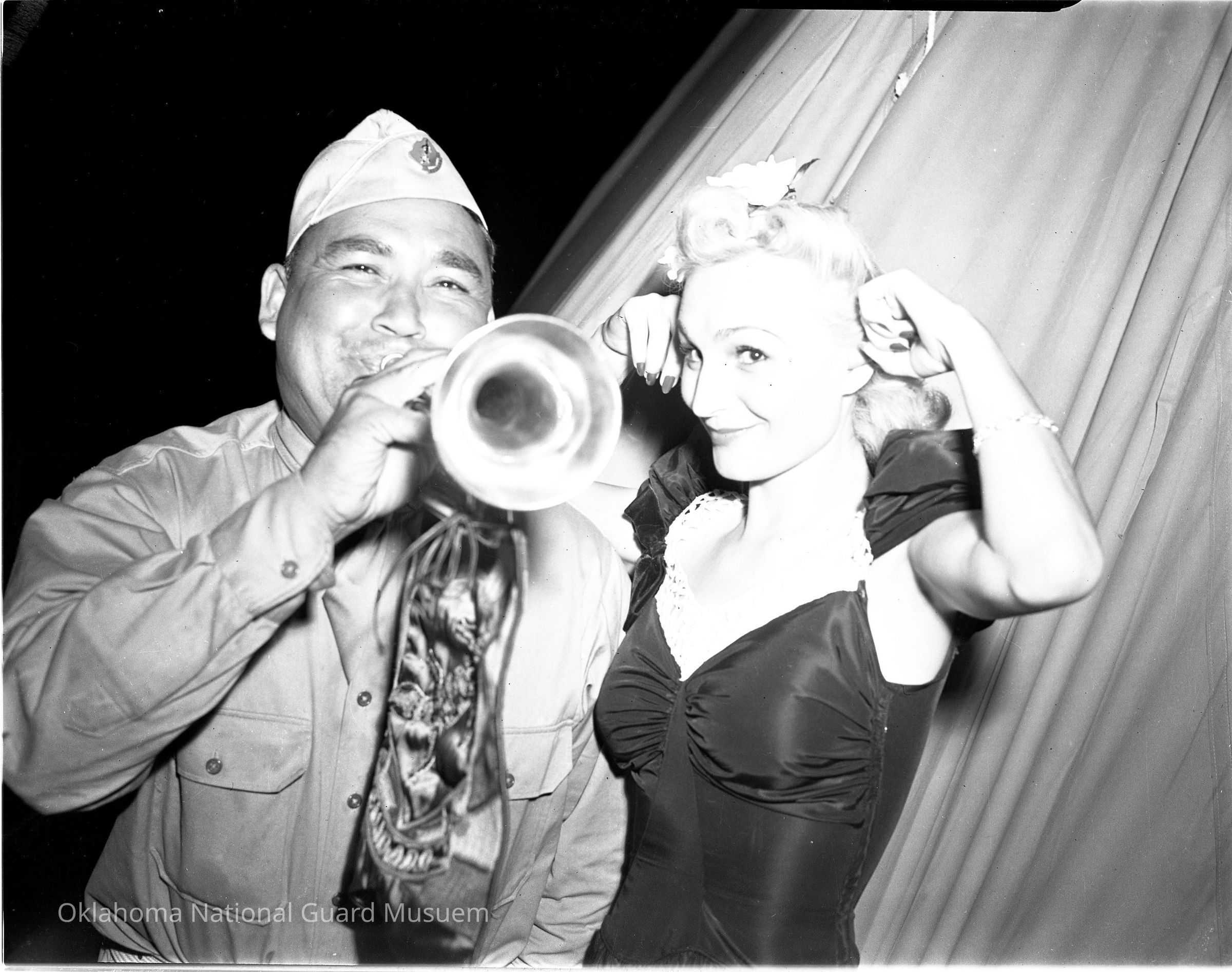 Negative of a soldier playing a bugle while a female entertainer stands beside him