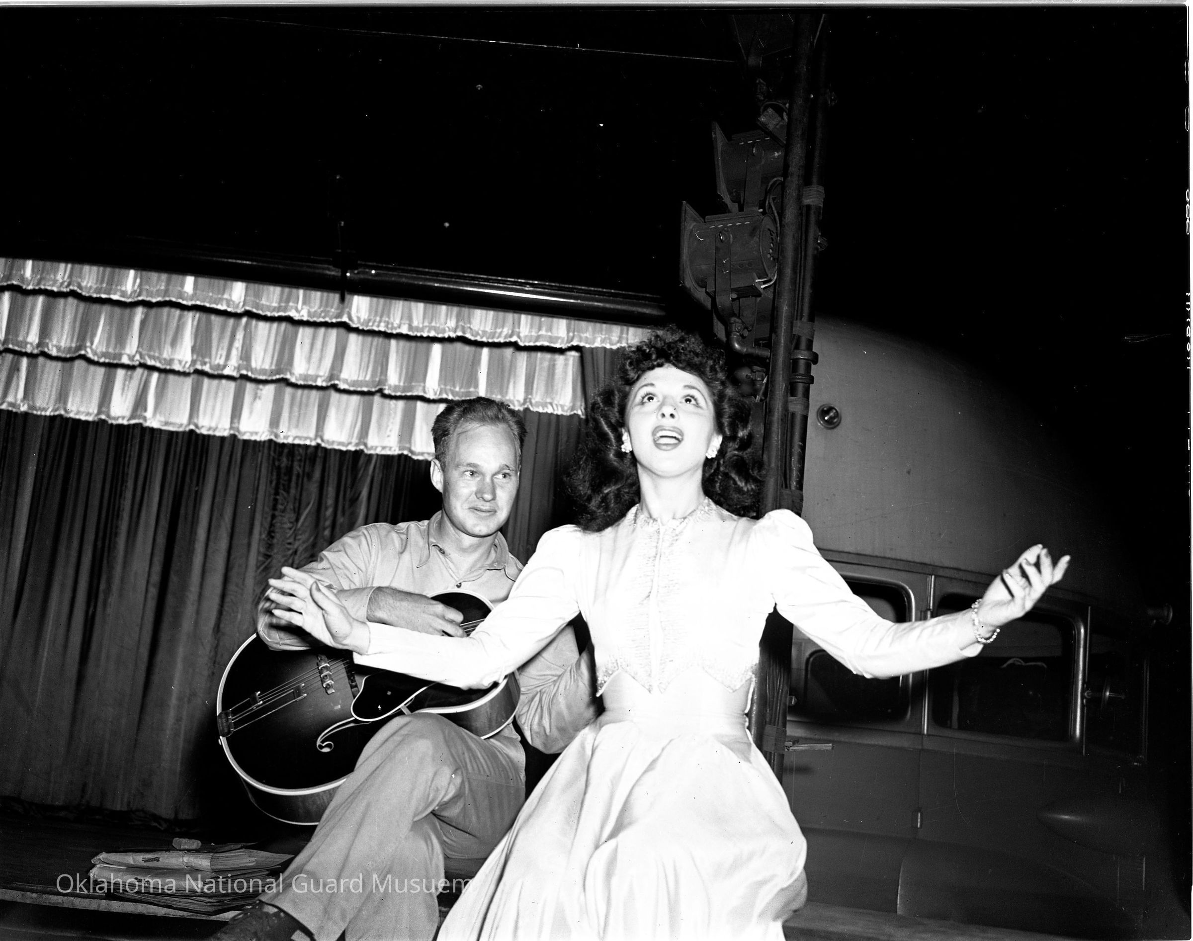 Negative of a soldier playing a guitar while a female entertainer sings with him