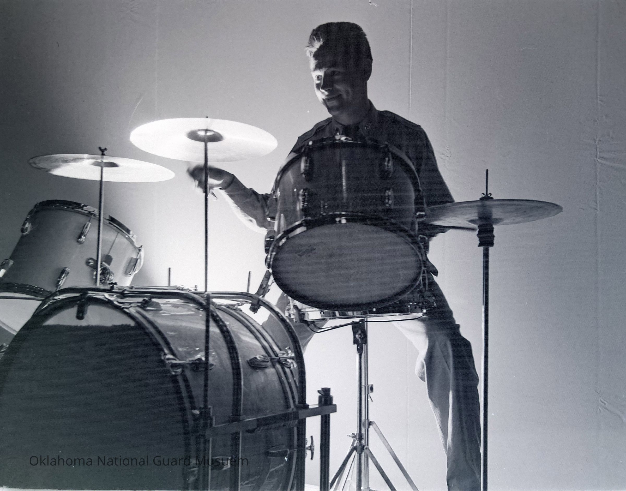 Negative of a soldier playing drums at Camp Crawford. 45th Infantry Band