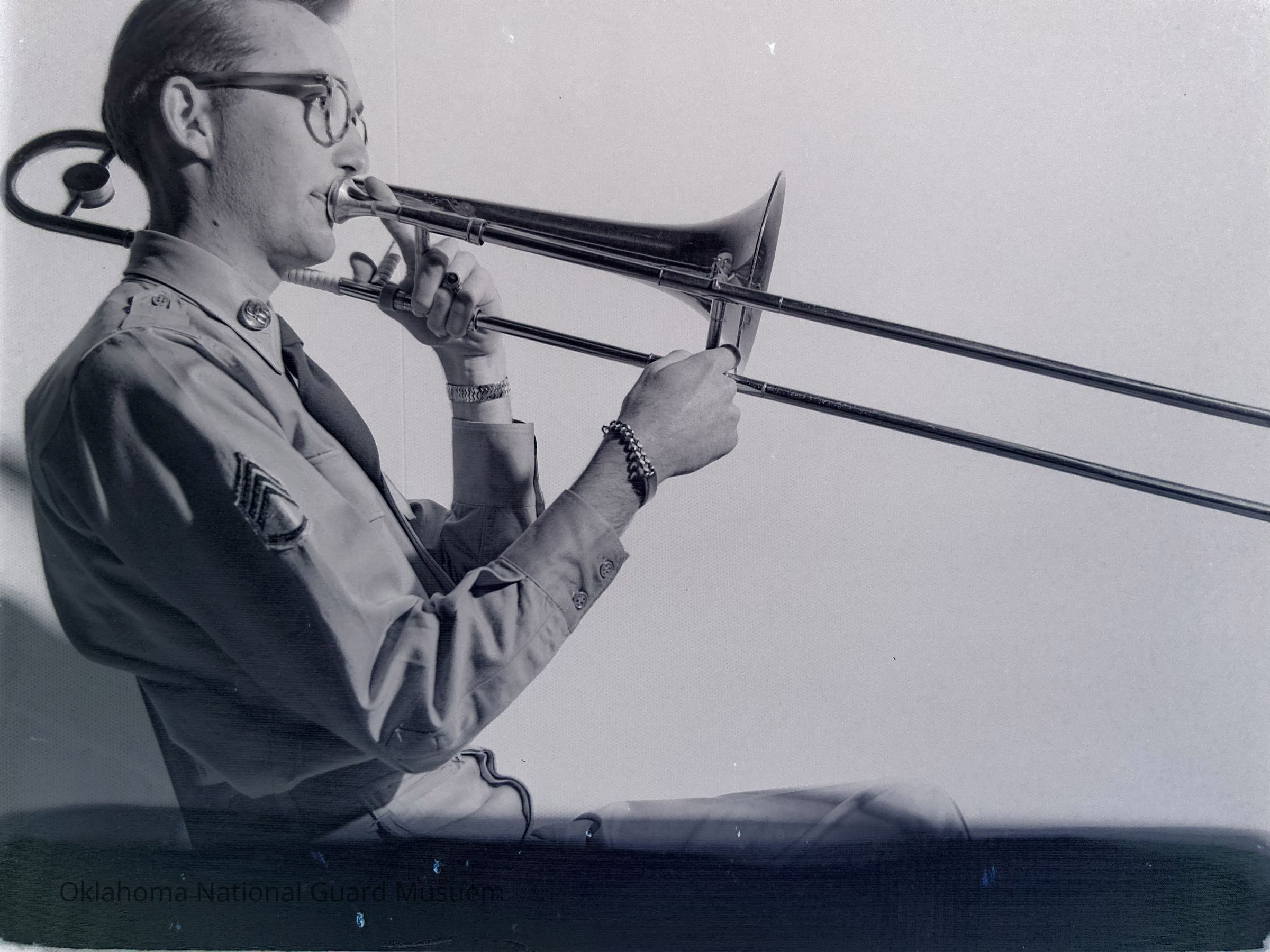 Negative of a soldier playing trombone at Camp Crawford. 45th Infantry Band