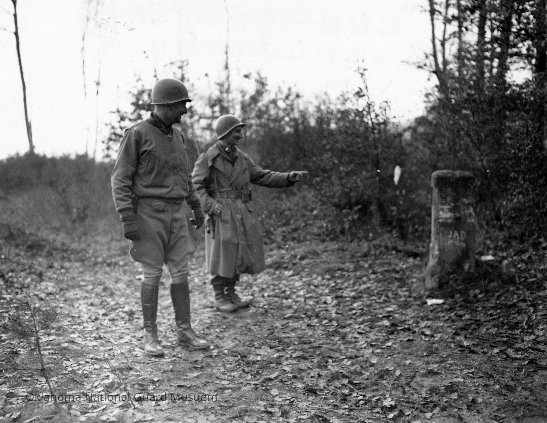 Norman Young of Company K 180th Infantry points out border stone to Brigadier General F.G. Butler
