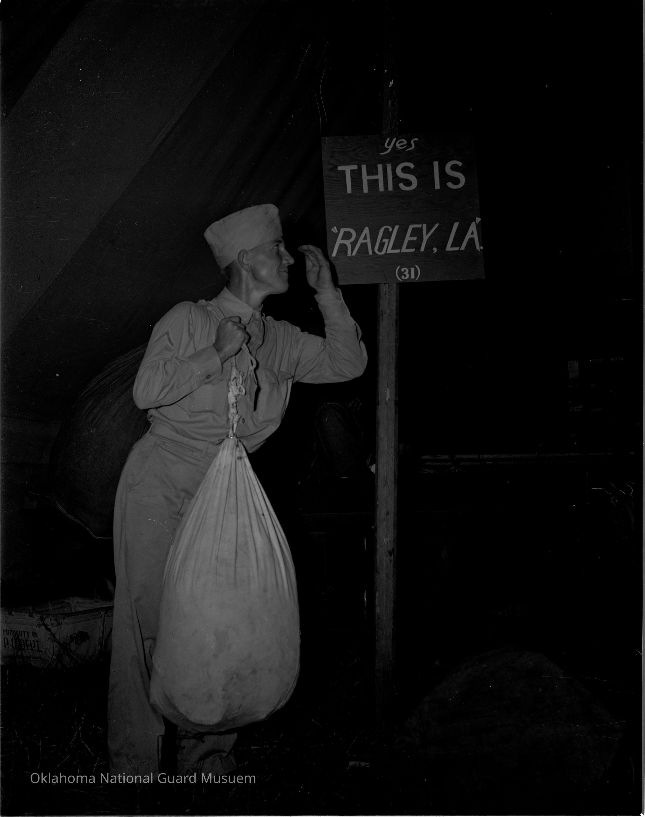 Negative of a soldier posed in front of signpost: "Yes, this is Ragley, LA"