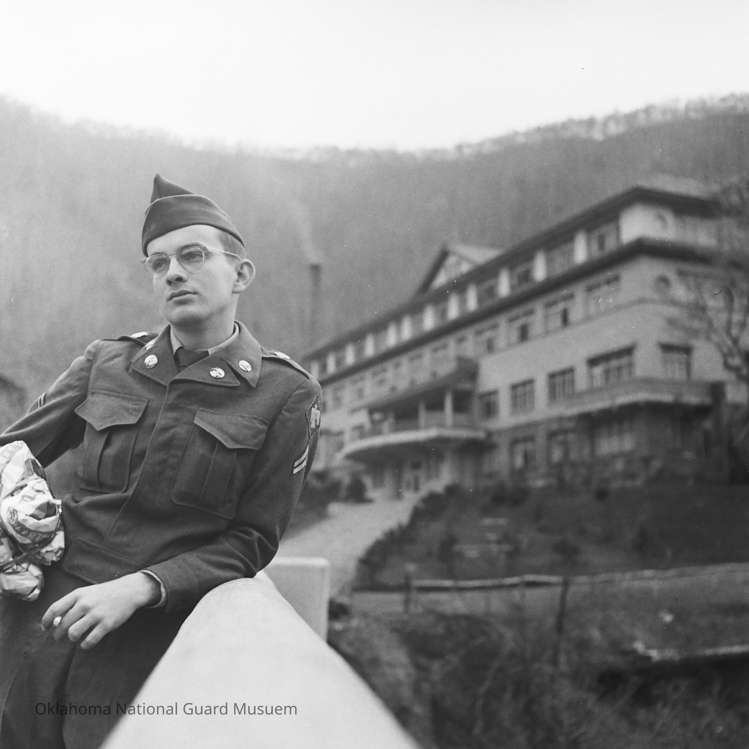 Negative of a soldier posed in front of the Noboribetsu Hotel