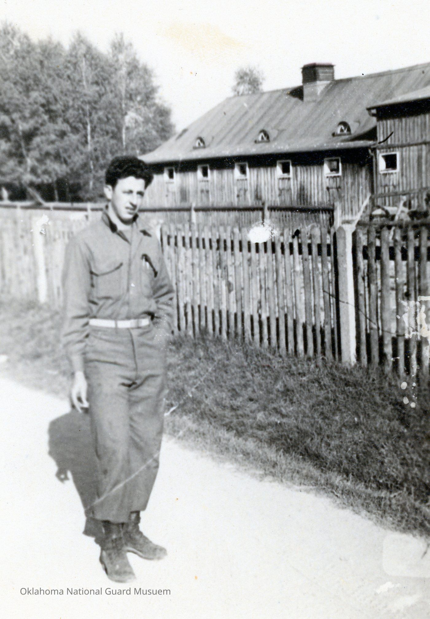 John Heinefelt posing in front of wooden barn 160th Field Artillery. John Embry's driver