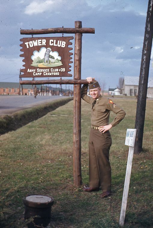 Soldier posing next to "Tower Club" sign at Camp Crawford