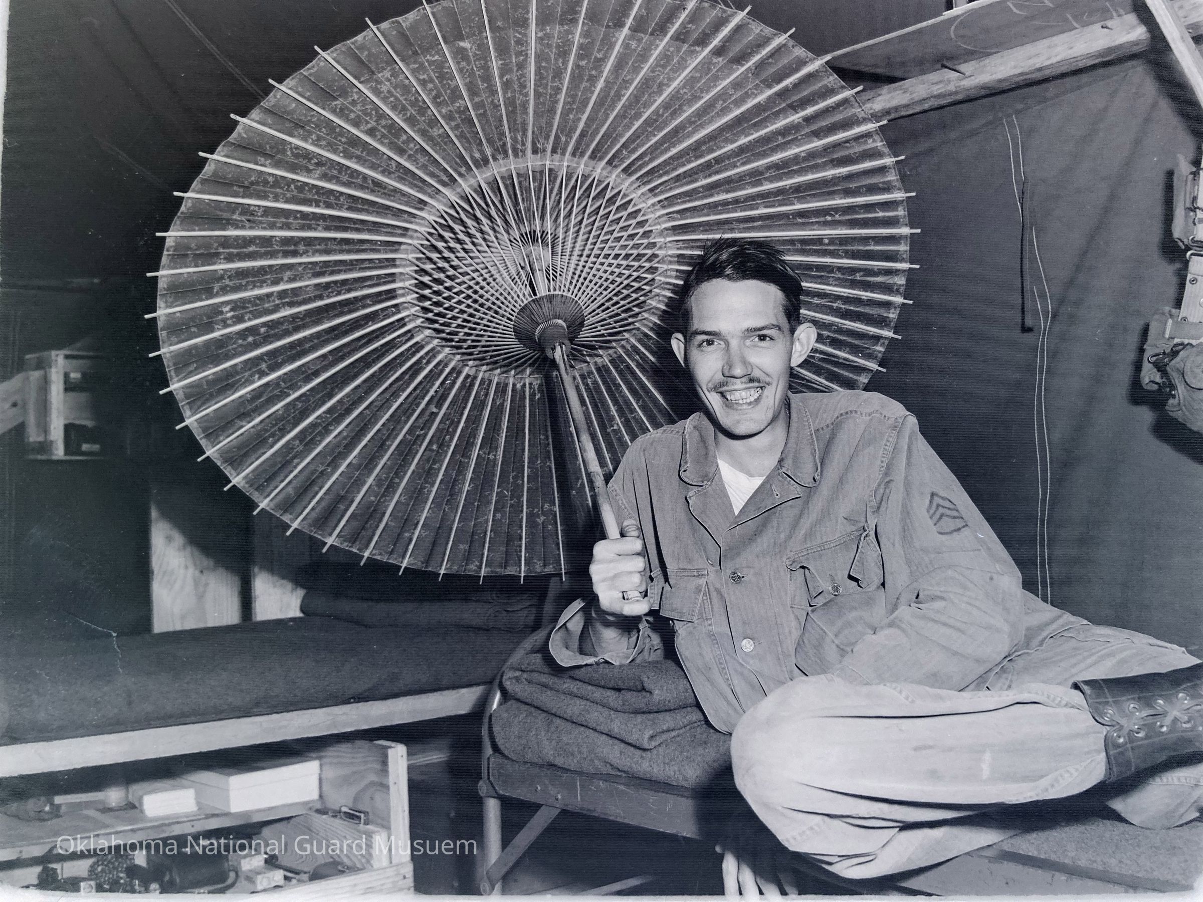 Soldier posing with a parasol