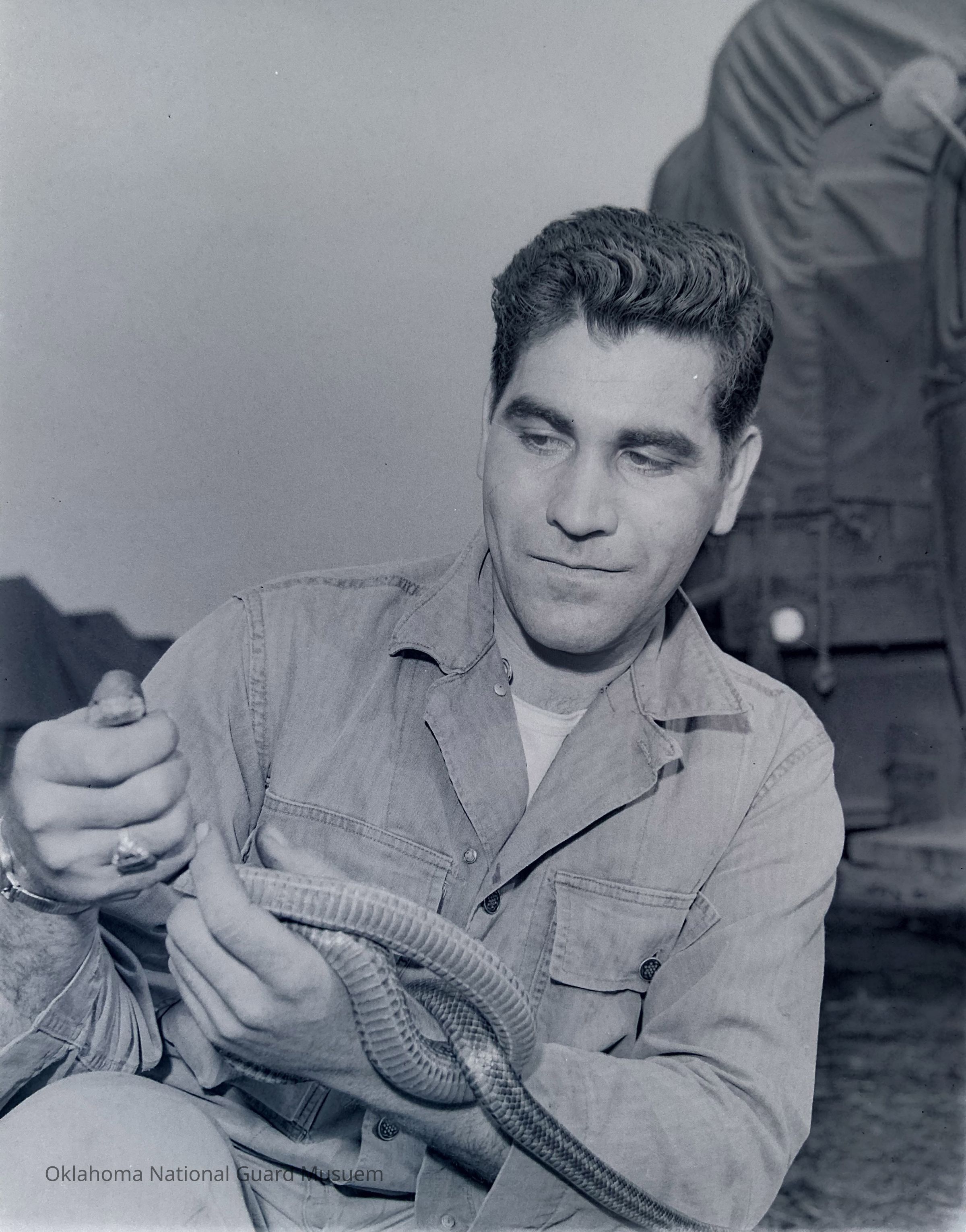 Soldier posing with a snake with a tent camp in background
