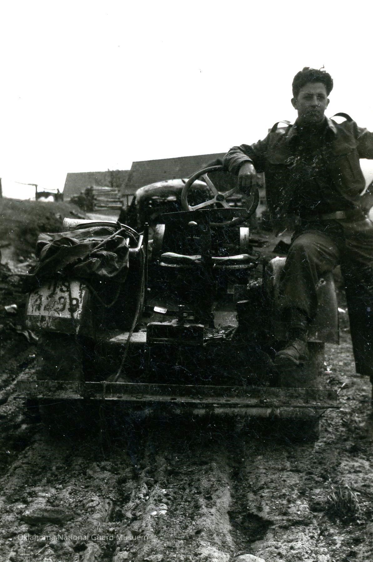 John Heinefelt posing with a destroyed vehicle 160th Field Artillery. John Embry's driver