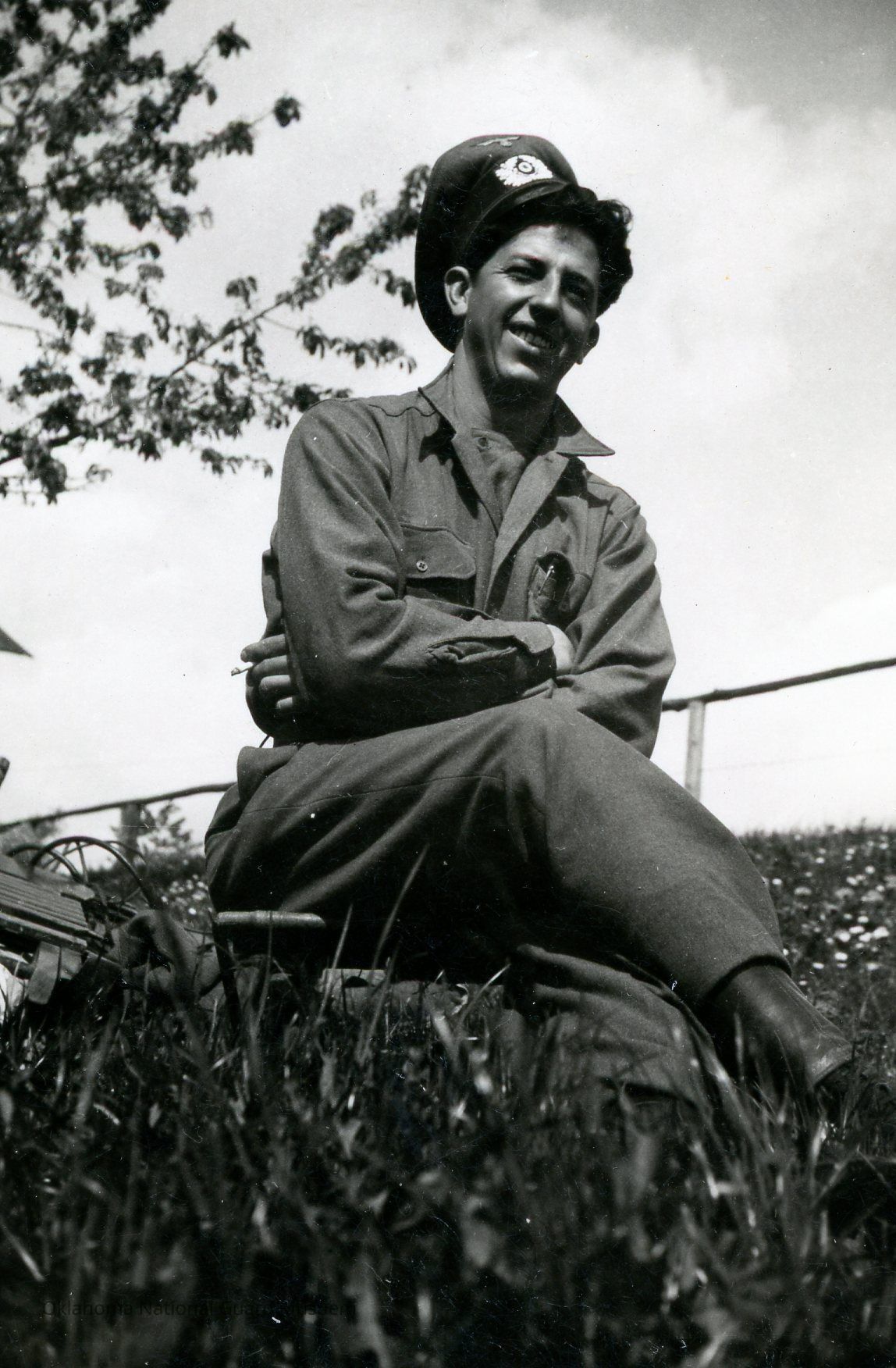 John Heinefelt posing with a German Cap 160th Field Artillery. John Embry's driver