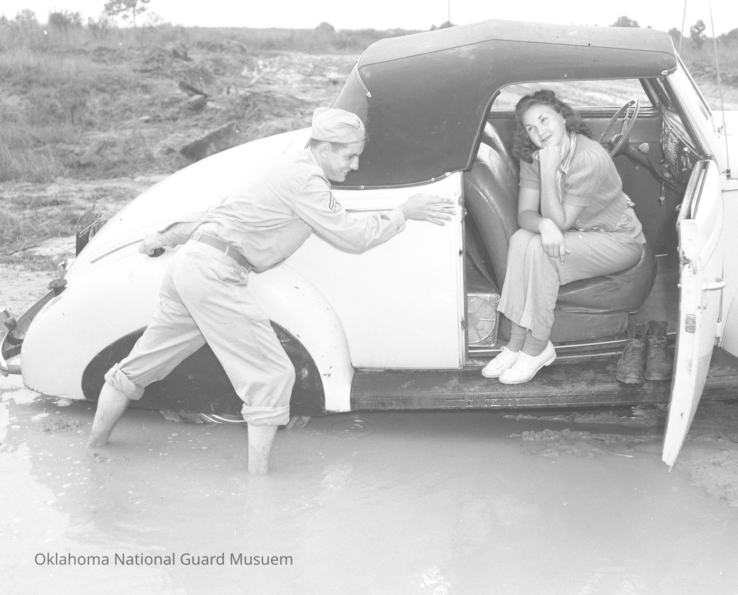 Negative of a soldier pushing a car out of the mud with a woman sitting in the car