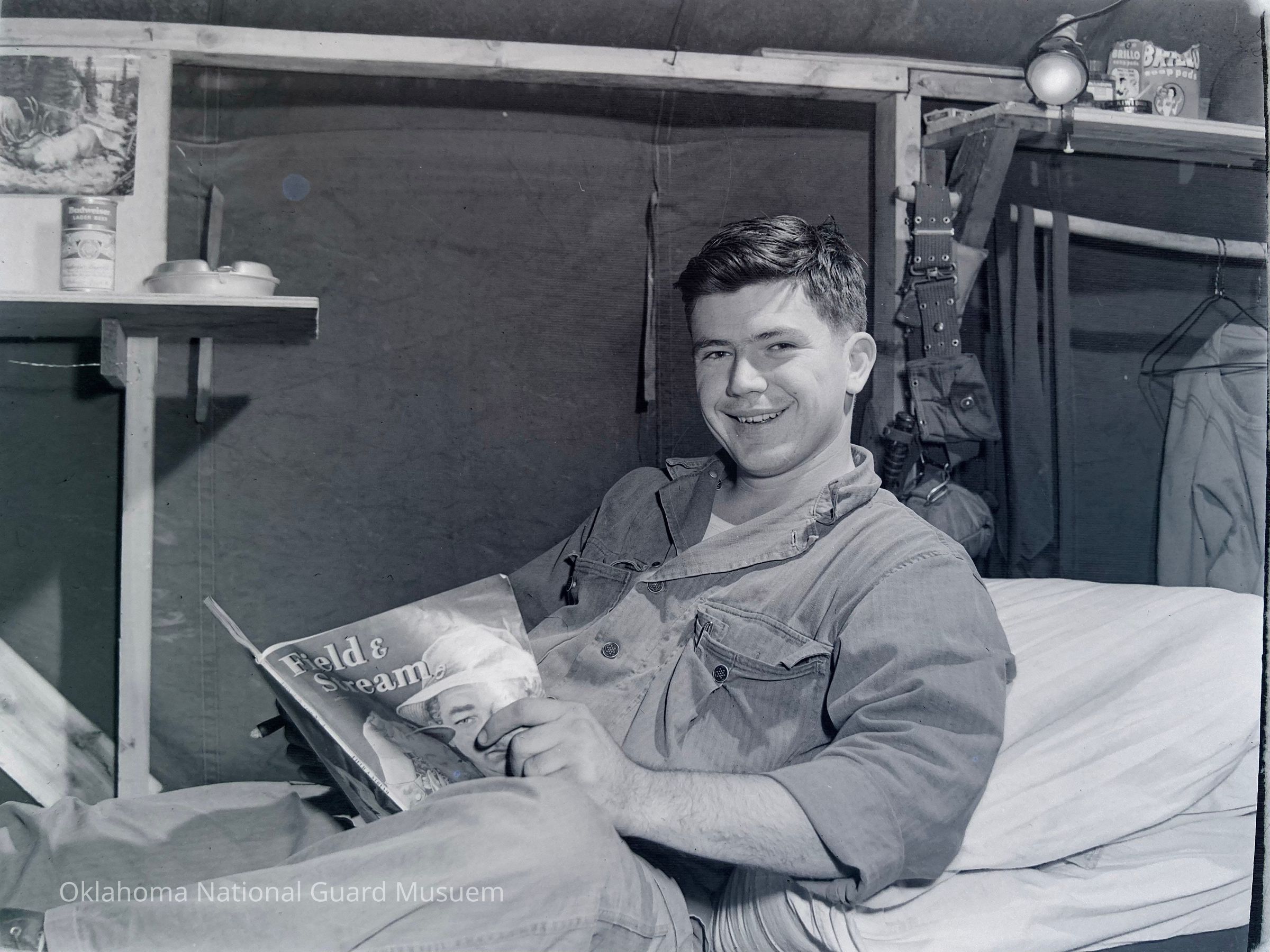Soldier reading a magazine on his bunk in the barracks